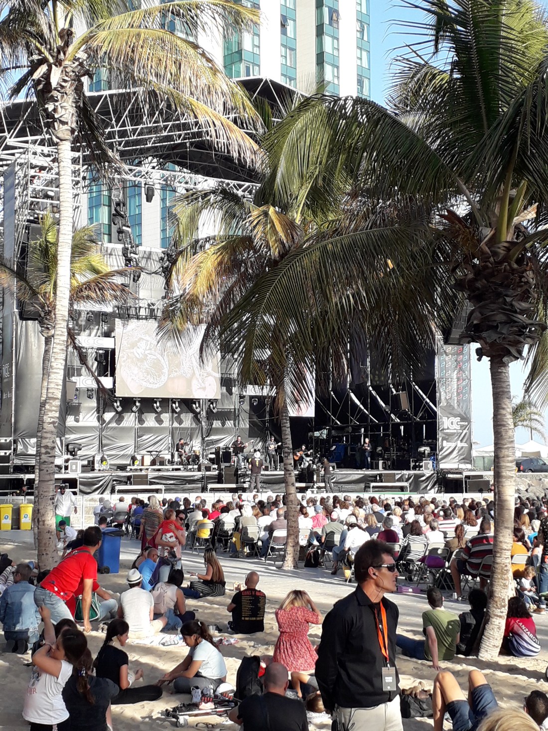 Ce soir, concert gratuit en bordure de plage. Énorme structure , groupes qui se succèdent, musique espagnole revisitée jazz, électro, c’est selon le groupe et c’est super. Il fait soleil et encore chaud bien qu’il soit déjà 19h30 pour nous. Un tas de manifestations sont programmées pour fêter les 100 ans de César Manrique, l’artiste qui a transformé Lanzarote en un musée à ciel ouvert .