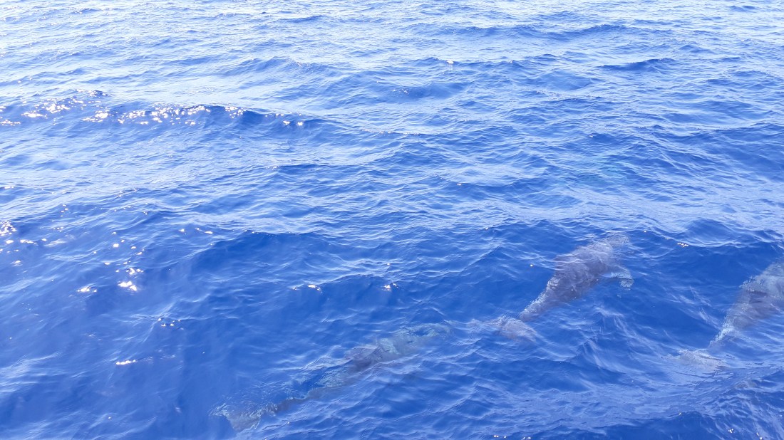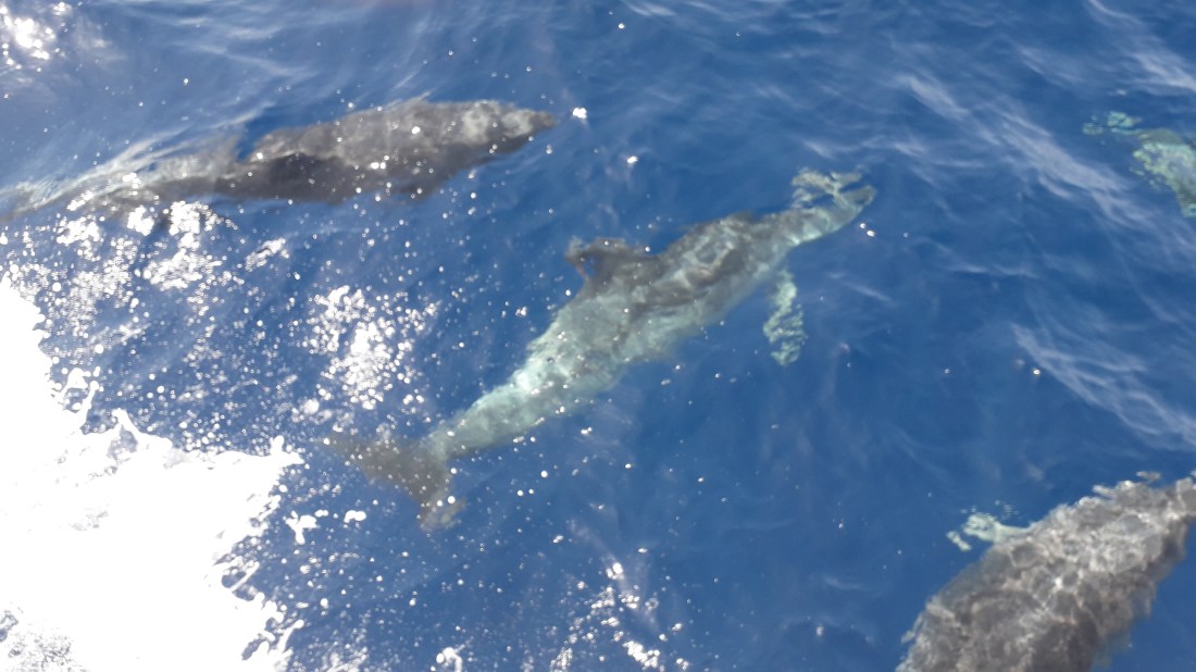 Mais, magique, on a vu des dauphins , un beau troupeau, des gros par rapport à ceux qu’ on voit habituellement. Ils nous ont accompagnés pendant plus d’un quart d’heure , à frôler le bateau, s’amuser avec l’étrave dans des glissades ultra rapides pour l’éviter, faisant des bonds hors de l’eau, un vrai festival ! … et puis , sans qu’ on sache quel est le signal, tout d’un coup, il n’y a plus personne !
