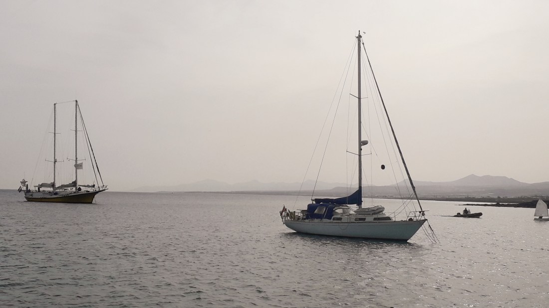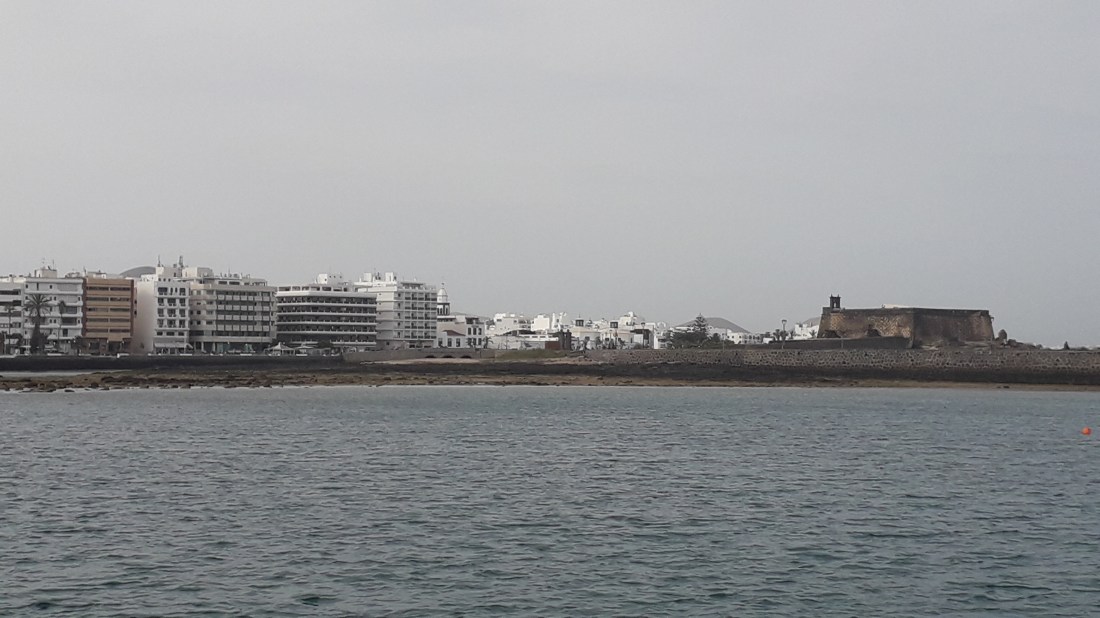Et voilà, nous sommes de retour à Arrecife … mais pas du tout le même paysage ! … cette fois ci, nous sommes dans l’ancien port d’Arrecife, au mouillage, derrière la digue , avec la ville face à nous, quand la marina est elle, un peu à l’écart de la ville.