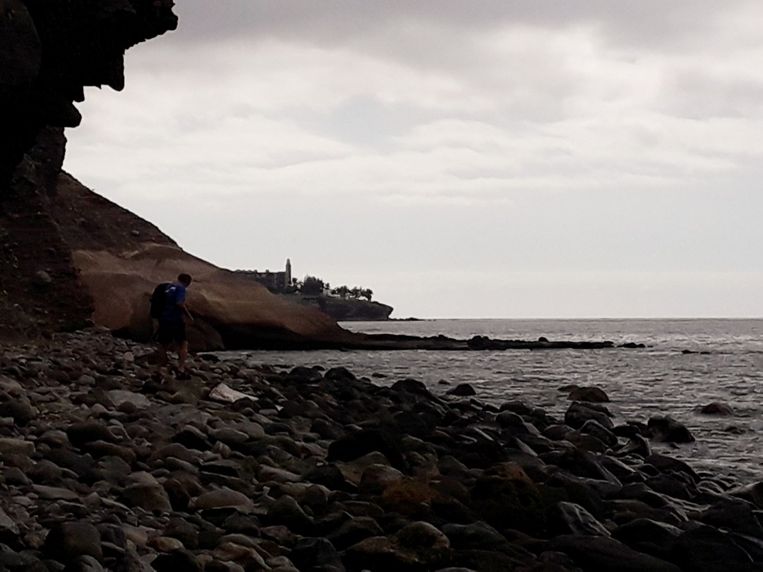Hier, on est allé marcher le long de la côte en suivant le pied de la falaise dans les rochers, jusqu’à la ville la bas au bout et le phare.