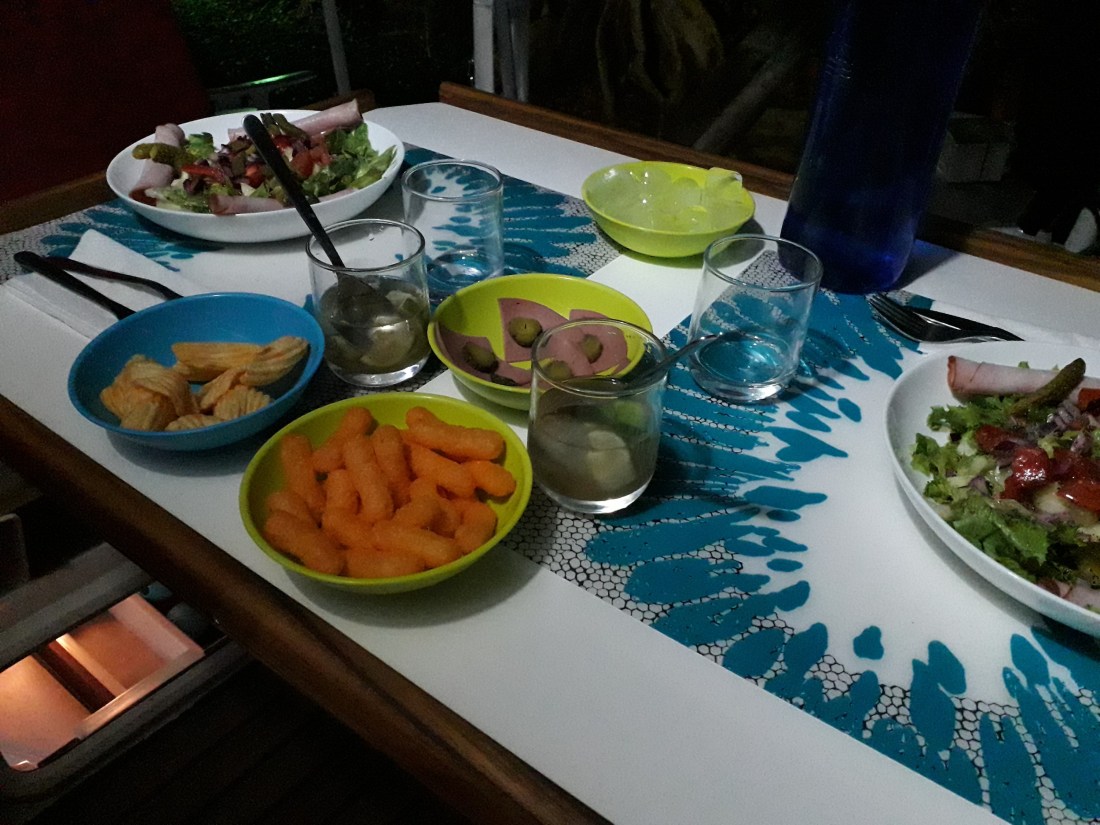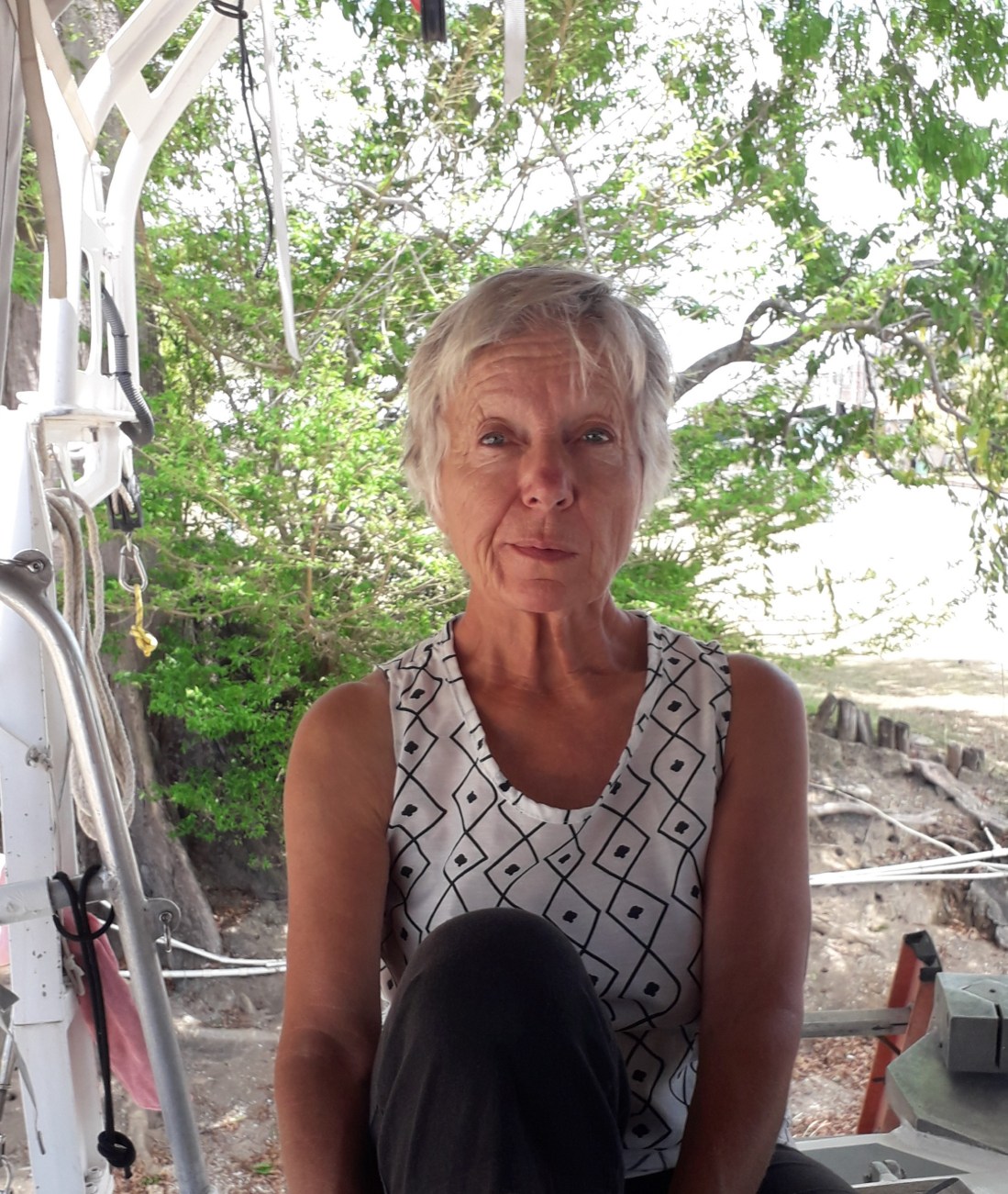 J’ai mis aujourd’hui pour fêter les 3 mois ici, le débardeur que j’avais cousu à petits points à la main, pendant la traversée … demi sourire juste !