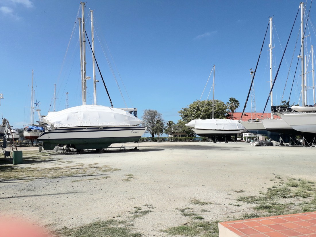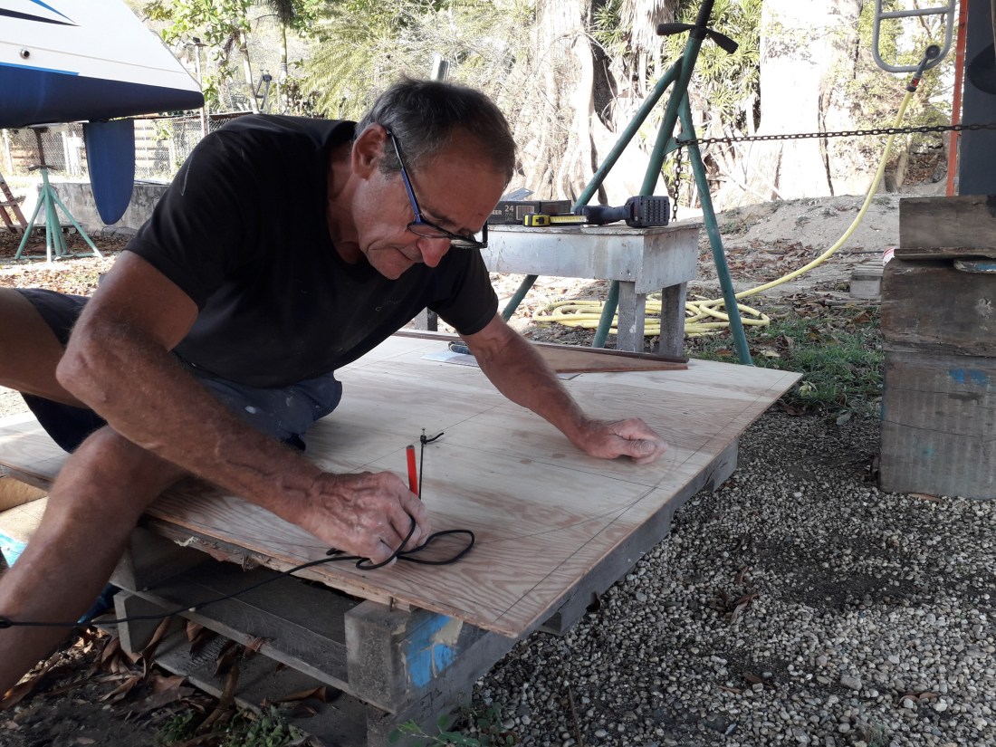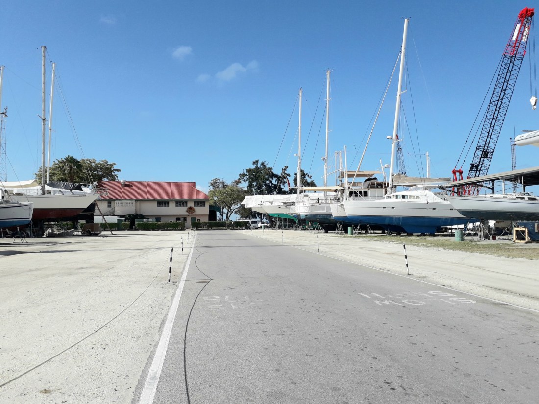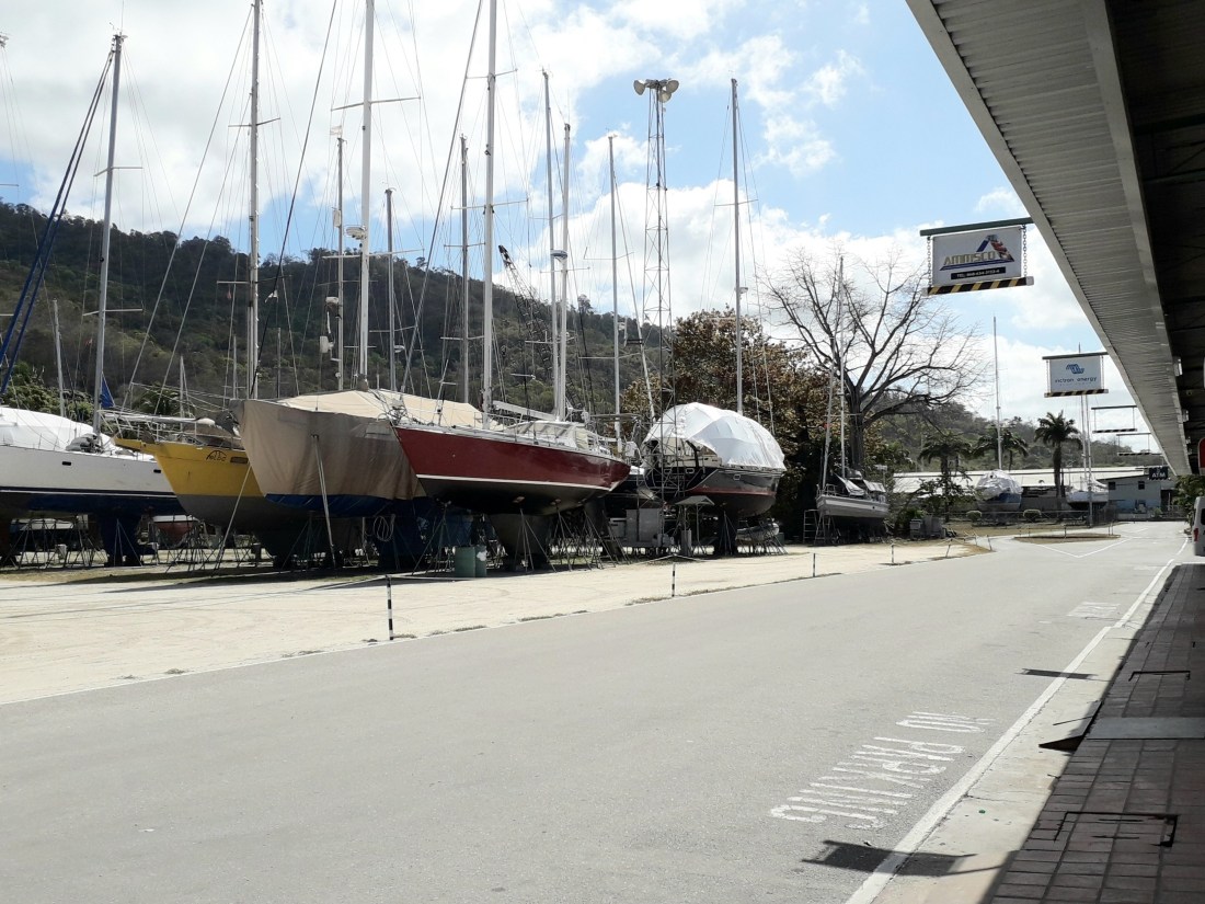 nous sommes revenus vers le chantier pour prendre nos vélos… ce n’est pas si loin, peut-être 6 km, et comme il n’y a pas de circulation, finalement, c’est faisable ! … mais heureusement, comme on entrait dans le chantier, une voiture en sortait et il nous a embarqué ! Super ! … bon, c’était pour rien, effectivement, le Centre de santé était fermé ! Même pas une permanence pour le week-end ! … alors, Erick est rentré avec ses points … et ce n’est pas si mal, car maintenant, avec 3 jours de plus, sa plaie semble mieux fermée, moins fragile.Donc, on remet ça demain !Et puis sinon, férié ou pas férié, on travaille ! … le blanc sur le pont est bientôt presque partout fait. L’antidérapant est fait sur le roof et la survie a retrouvé sa place , cette fois ci, sans qu’on y laisse la moitié d’un bout de doigt !On nettoie les winchs du cockpit, c’est long et on s’en sort les mains graisseuses ! …On a réparé l’évacuation des eaux de dégivrage du frigo … ça n’avait jamais marché …il a fallu démonter une bonne partie du plancher sous le frigo et pas étonnant que ça ne marche pas, le tuyau était complètement plié et ça depuis la construction certainement ! … une bonne chose de faite ! …On marche le soir, on fait des tours de chantier , histoire de ne pas rouiller.Et on se demande jusqu’à quand cela va durer ! … confinement ici prévu jusqu’au 30 avril… et après, la dérive , ce sera pour quand ?