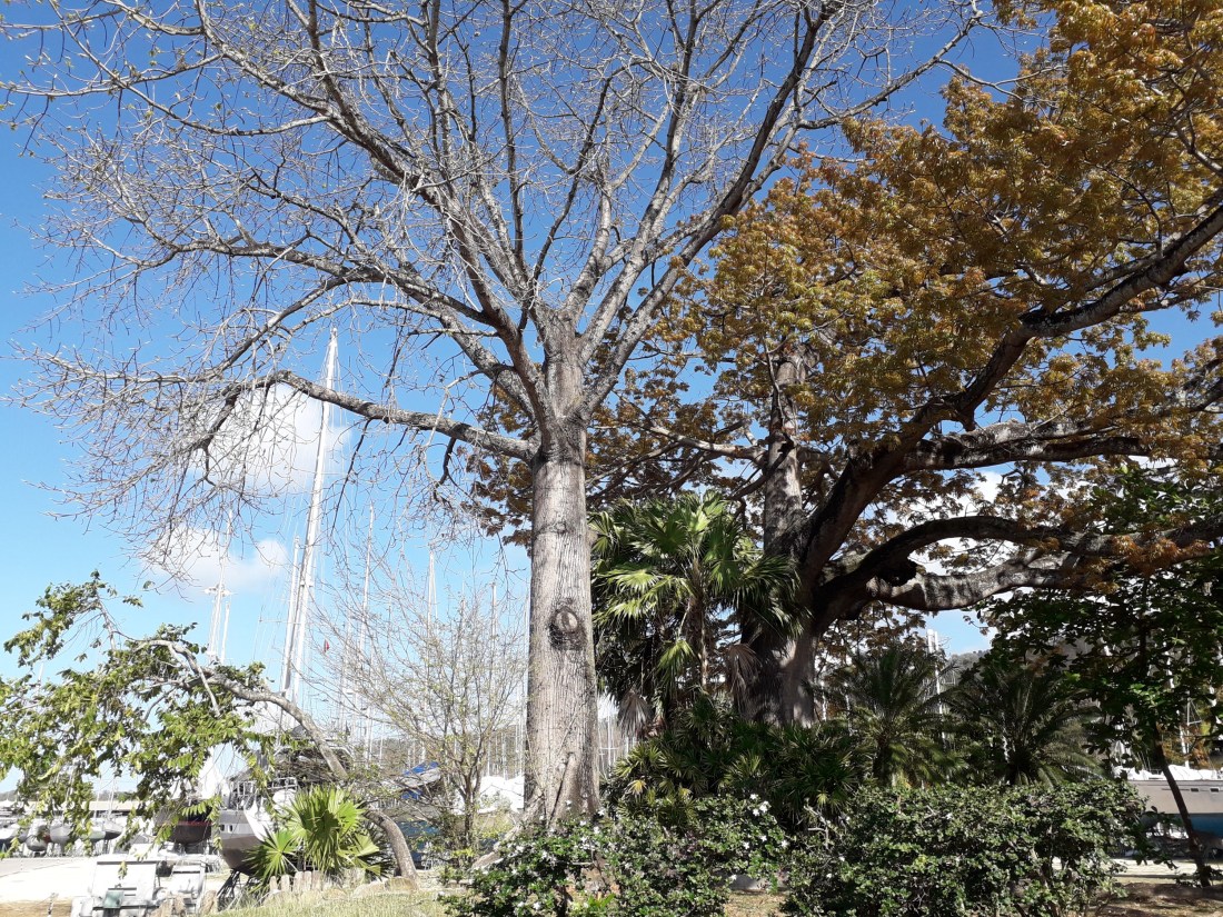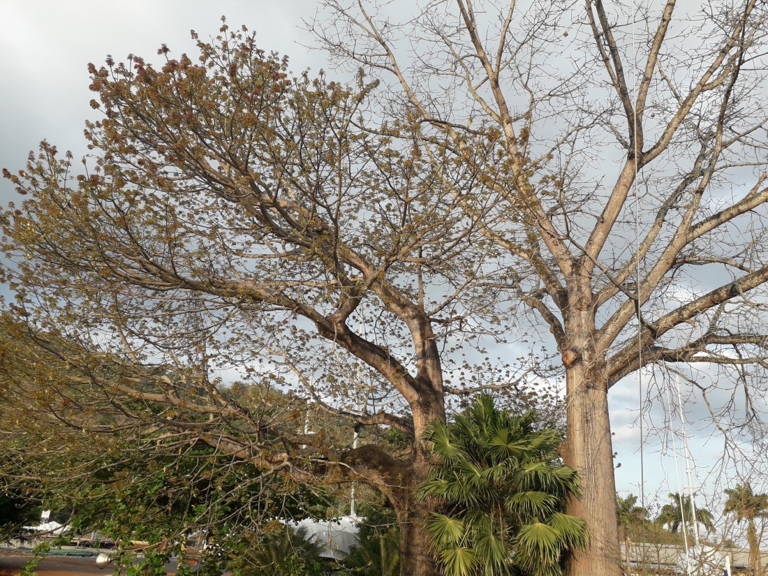 On regarde les saisons passer , quand on aurait penser qu’ici, il y avait saison des pluies, saison sèche, dans laquelle nous sommes … mais non, c’est plus varié que ça… on vient de vivre en quelques jours, l’automne et maintenant le printemps !Je vous avais dit dans un message précédent que les fromagers perdaient leurs feuilles … et ça a duré. .. jusqu’à ce que toutes les feuilles soient tombées ! … en même temps, les bourgeons apparaissaient .. et maintenant, une semaine après la chute totale des feuilles du fromager à gauche , il est à nouveau couvert de petites feuilles toutes neuves ! L’autre a un peu de retard , mais les bourgeons sont prêts !Les arbustes autour ont aussi perdu leurs feuilles et ont immédiatement mis en route l’éclosion des nouvelles.