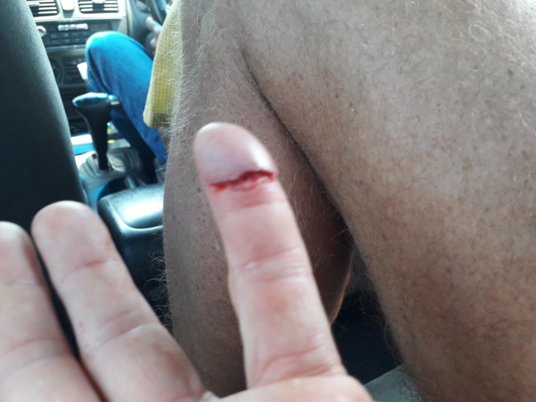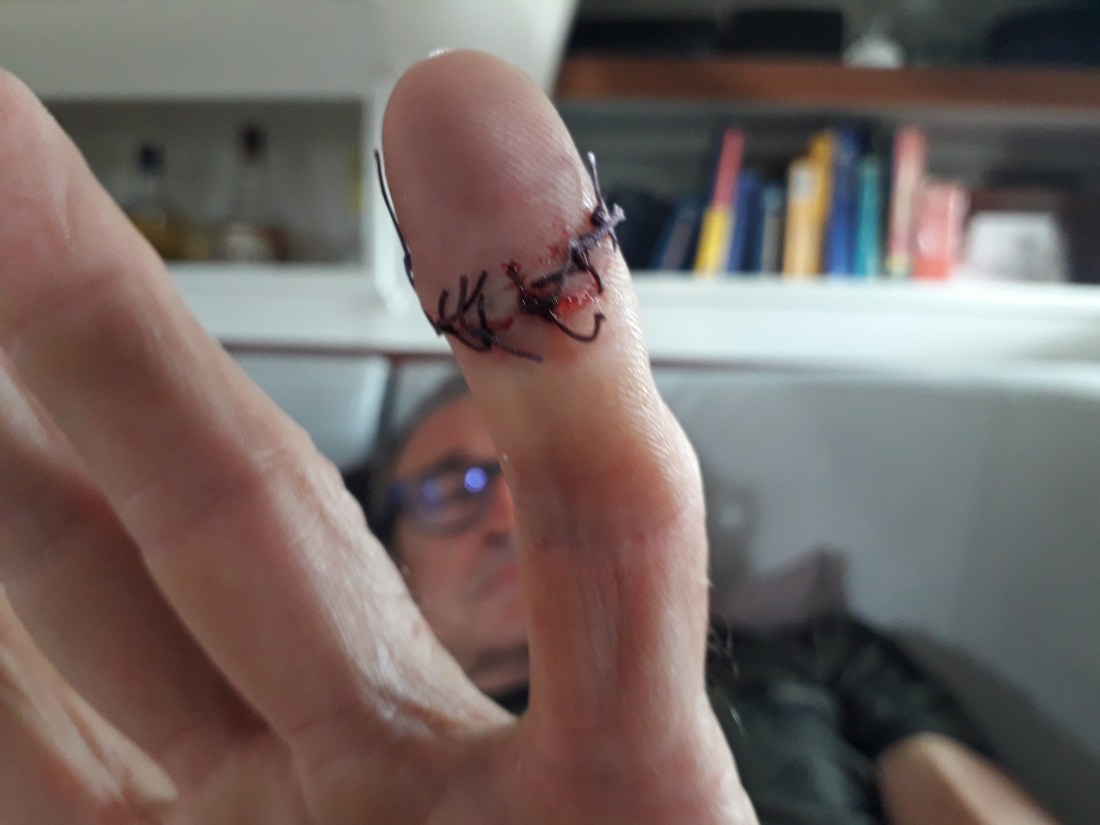 Aujourd’hui, ah, enfin, un peu de changement ! … en voulant déplacer la survie, Erick s’est sérieusement coupé le petit doigt de la main gauche. Une belle plaie profonde qui fait presque toute l’épaisseur du doigt. Alors, taxi, direction Carenage, la ville à côté, entre le chantier où on est et Port of Spain.