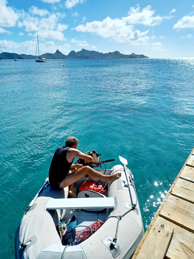 Erick tout à l’heure m’a déposée au ponton et avait prévu d’aller faire un peu de snorkelling … mais cette cochonnerie de moteur de l’annexe ne voulait plus démarrer… problème de carburateur on dirait. Alors , changement de programme, il est retourné à la rame au bateau jouer au mécanicien. J’espère qu’il aura résolu le problème… au moins pour qu’il puisse venir me rechercher ! 🥴
