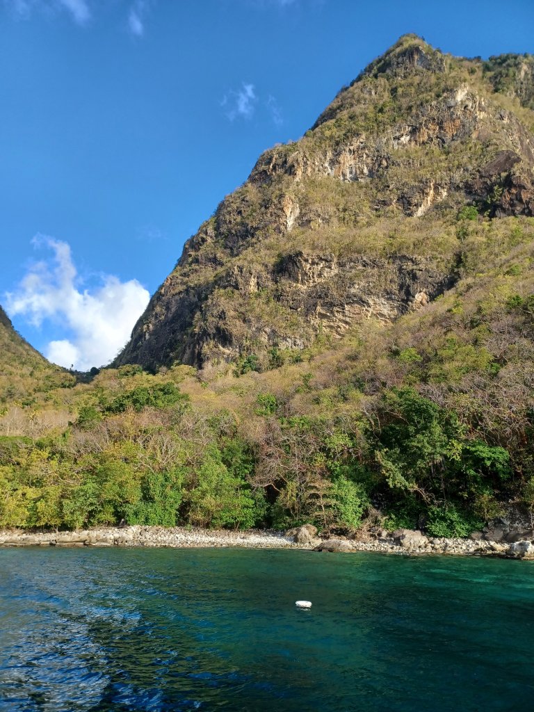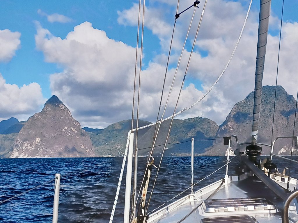 Mercredi matin, on part à 6 heures du matin pour remonter vers … là où on pourra ! Le vent fort est de retour, avec une mer plutôt agitée. Princess Julia remonte avec énergie dans un long bord qui nous éloigne vers le large de notre route directe vers le nord. On choisit de s’arrêter aux 2 Pitons, sur Sainte Lucie. Ça veut dire un autre bord dans l’autre sens pour revenir vers la côte… et après, il suffit de passer entre les 2 canines qui se dressent devant nous, avant d’entrer dans la baie.