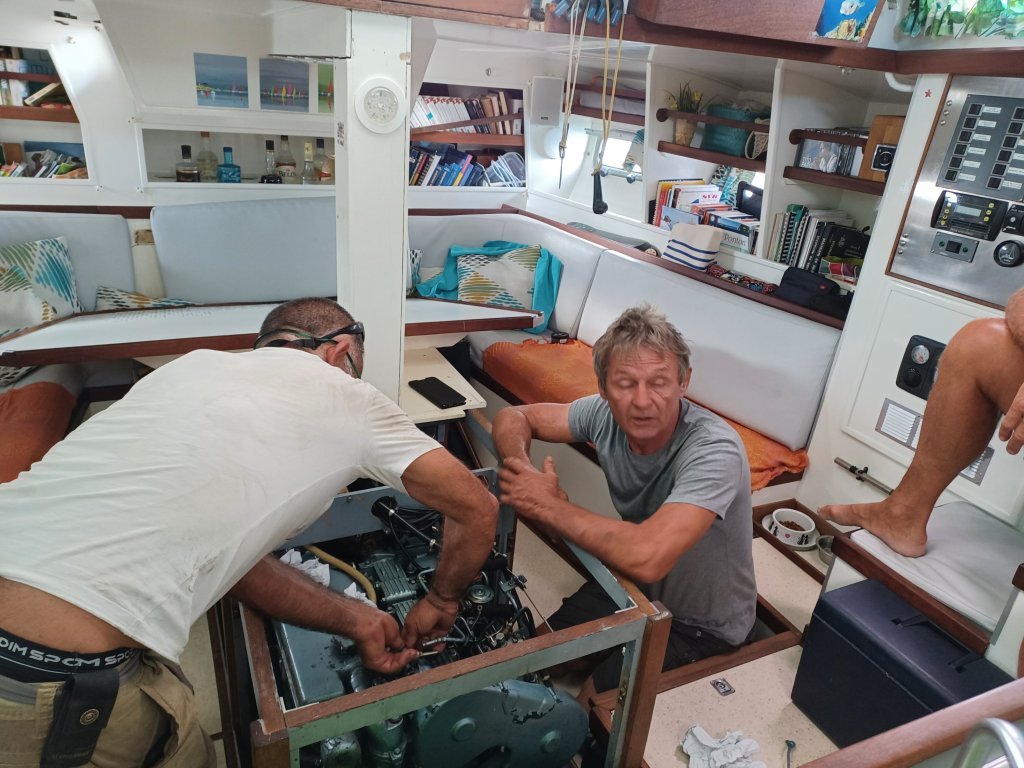 Alors voilà. Le moteur peut fonctionner mais pour de courts trajets, une entrée de port par exemple pour l’arrivée aux Açores, sinon ce sera voiles obligatoirement. Et après chaque utilisation du moteur, en fonction de la consistance de l’huile sur la tirette, vidanger et mettre de l’huile neuve. Il faudra partir avec une provision de bidons.