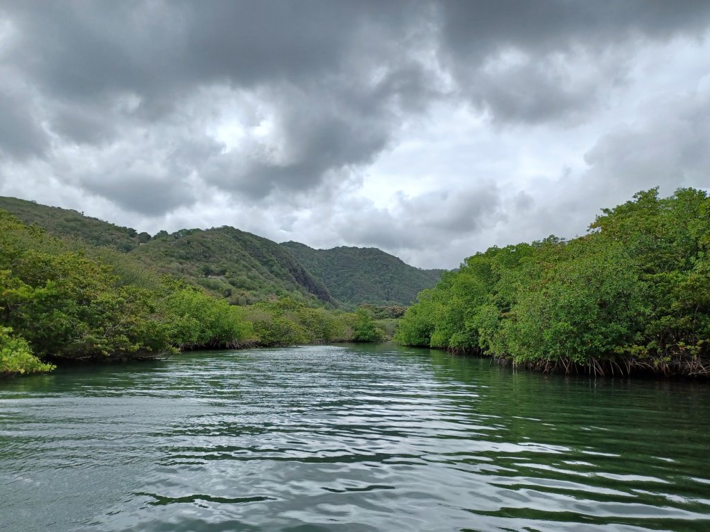 On est aussi allés explorer la petite rivière dont on voit l’embouchure tout près de là où on est mouillés. Comme une remontée d’une petite Amazone, grand silence au milieu des palétuviers. Bien agréable ! Bon, en fait, ça permet d’arriver à un petit port pour annexes qui donne accès aux magasins de la zone de Carénage. C’est là qu’on a pu acheter l’huile !