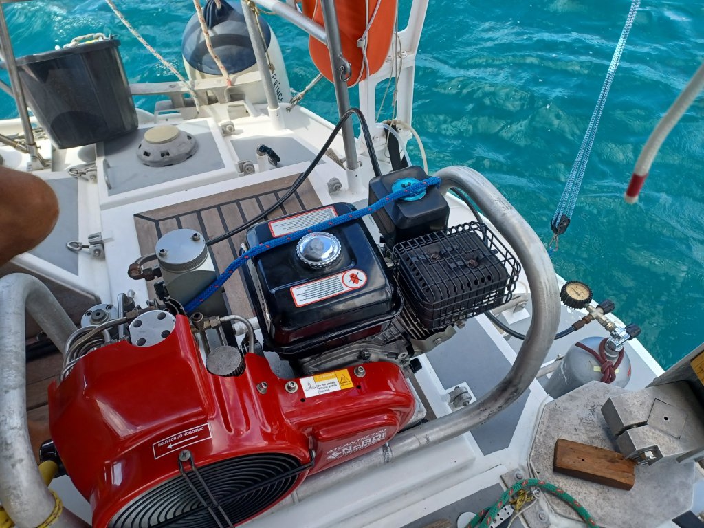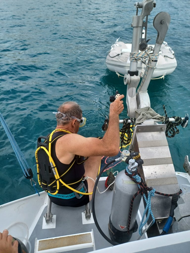 Car il a fallu gonfler les bouteilles d’abord. Et ça fait une bonne sonorisation du mouillage ! Heureusement, on est loin des voiliers voisins
