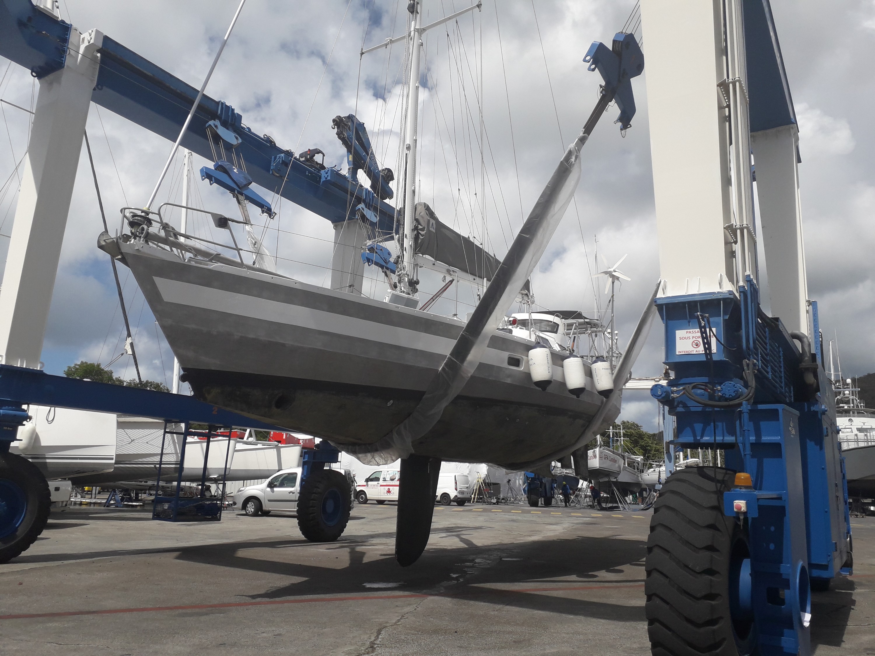 Enfin, 11h30 c’est notre tour ! Ils viennent chercher Princess Julia avec le travel lift , mais c’était clair qu’il n’y avait pas l’espace suffisant pour manœuvrer et sortir le bateau ! Bon il a fallu aller chercher le chariot qui permet de juste le soulever, l’extraire de la rangée de bateaux où elle était la Princess et la transporter dans l’allée où là, le travel lift pouvait la récupérer.