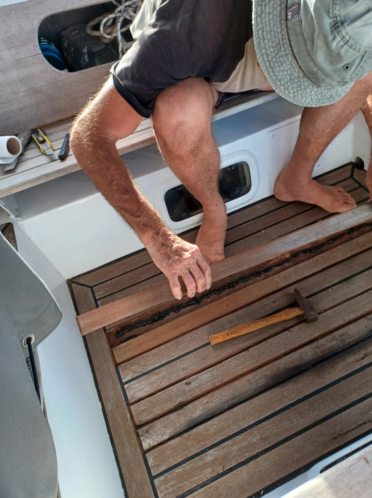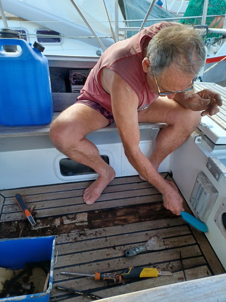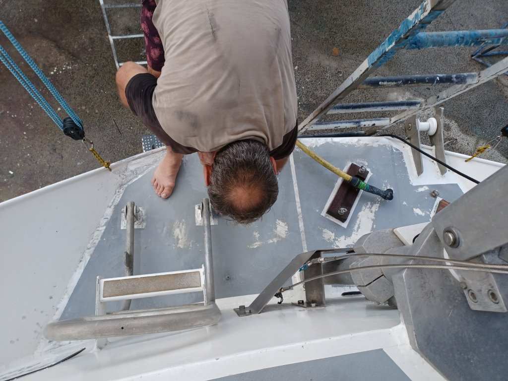 Erick s’est lancé à poncer la plage arrière pour la repeindre à nouveau. Elle s’abime très vite car elle est très sollicitée pour monter et descendre.