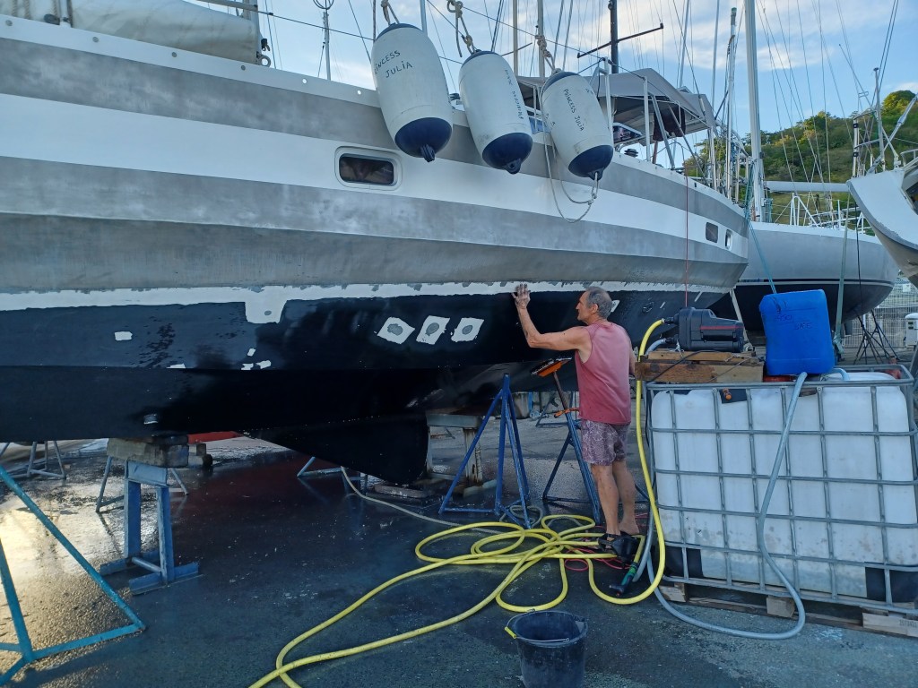 Et puis, ça c’était prévu, décaper toute la peinture au niveau de la ligne de flottaison pour refaire bien propre. A Trinidad, il y avait eu des attaques d’électrolyse et il fallait bien gérer ça un jour.