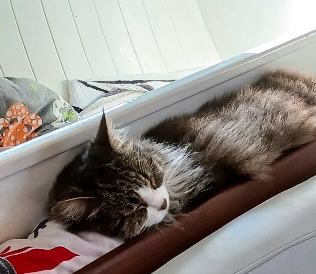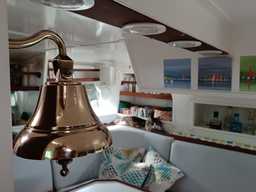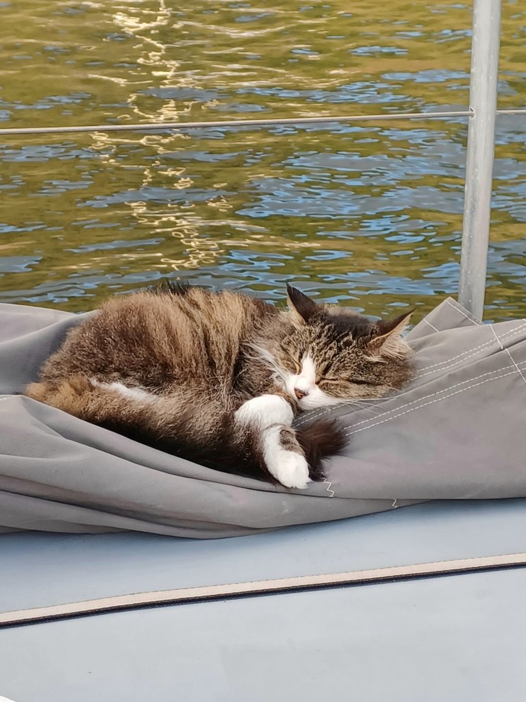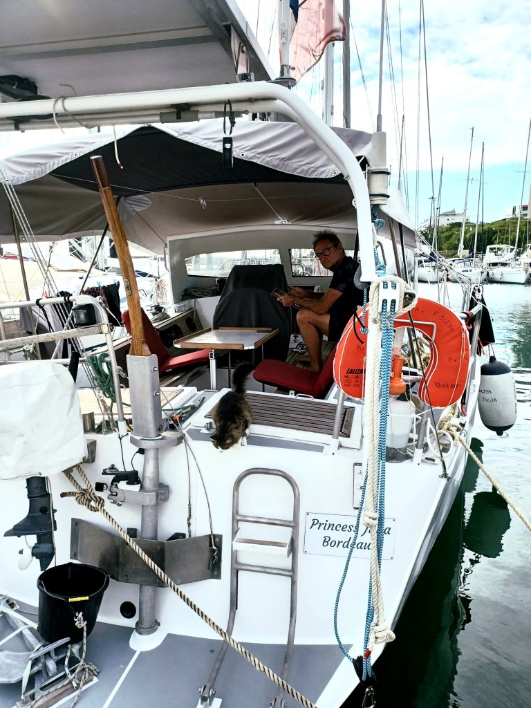 Mina, comme à chaque voyage a été parfaite. Très sage, pas un miaulement, même pas peur au contrôle de police mais très contente d’arriver et de sortir enfin de son sac pour explorer tous les recoins du bateau.