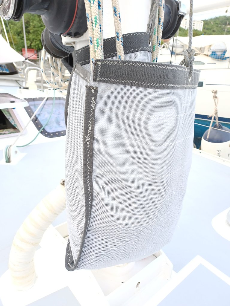 Ah, j’ai mis en place la nouvelle poche à drisses que j’ai faite à Gradignan grâce à la belle machine à coudre de Roger.