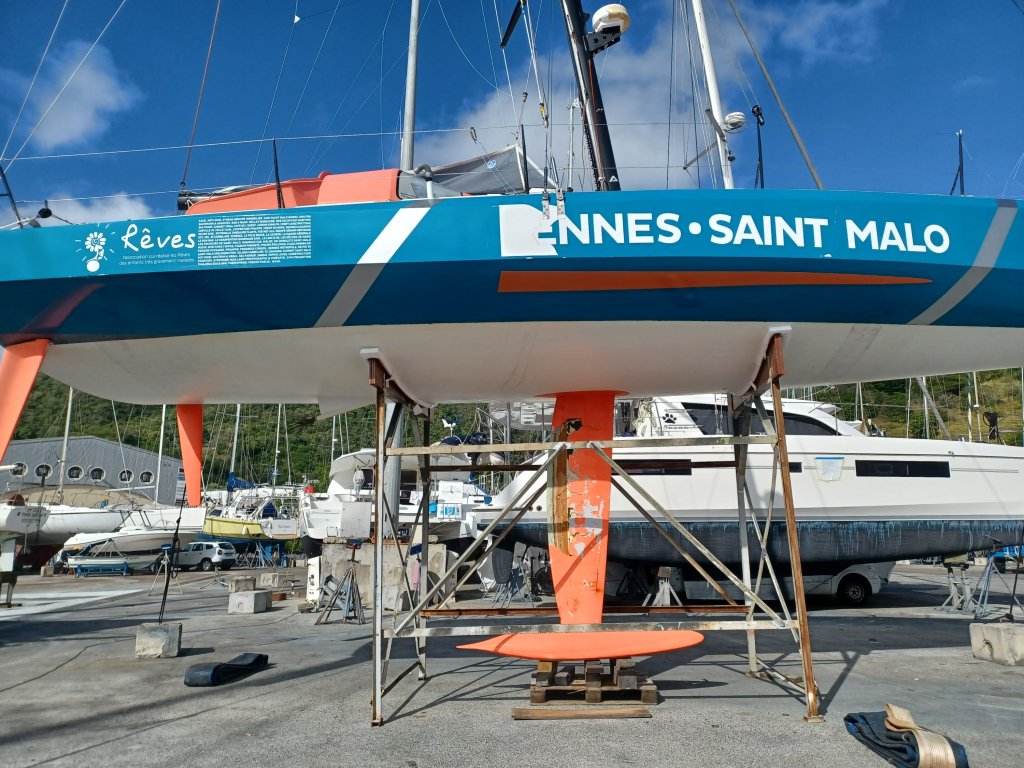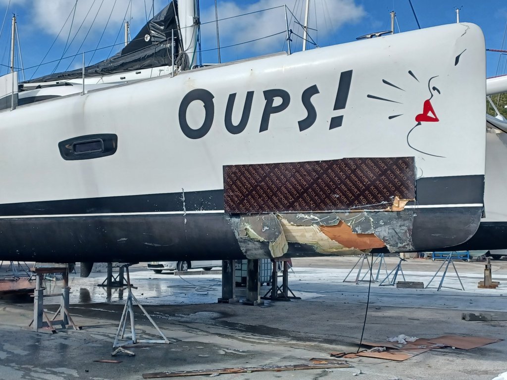 On a de nouveaux voisins ! Oups, un magnifique catamaran déjà à côté de nous en juin. Une joyeuse équipe, ils avaient entièrement remis le bateau à neuf, tout bien repeint, polishé. Le bateau était trop beau, un Marsaudon 50 pieds, il y en a pour des sous ! Et là, il revient, un flotteur explosé ! … le propriétaire l’avait prêté à François Gabard … et ils ont heurté une baleine en arrivant sur Sainte Lucie ! … pas cool ! Un gros trou de chaque côté ! Il y a 4 mois de travaux !