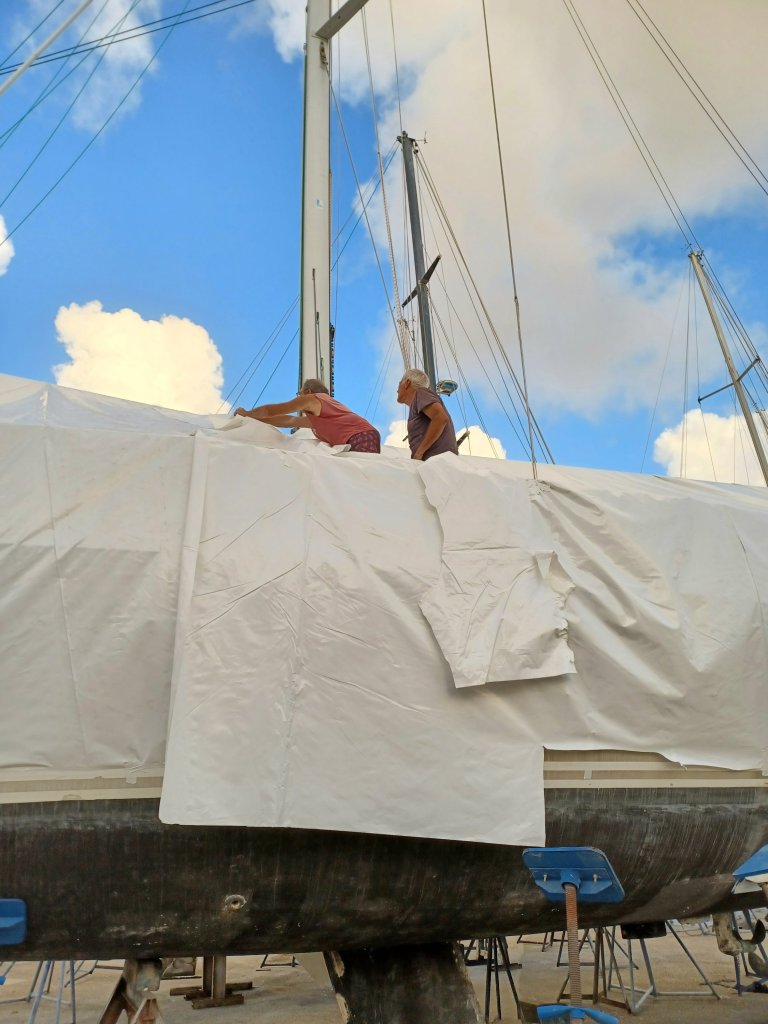Il faut finir de préparer le bateau. On a mis la grand voile mais on attend d’être à l’eau et pouvoir se mettre face au vent pour mettre le génois en place.