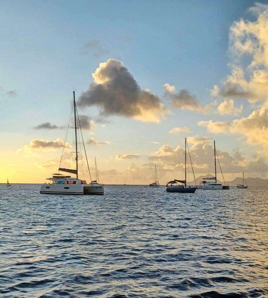 Juste, on regrette le mouillage où l’air est agréable, ici il fait très chaud. En plus bien sûr, on a retrouvé les moustiques ! Et perdu les beaux couchers de soleil avec le Diamant a l’horizon ! Ça c’est notre dernier coucher de soleil. Quand nous sommes arrivés, fin mars, le soleil se couchait à gauche du Diamant !