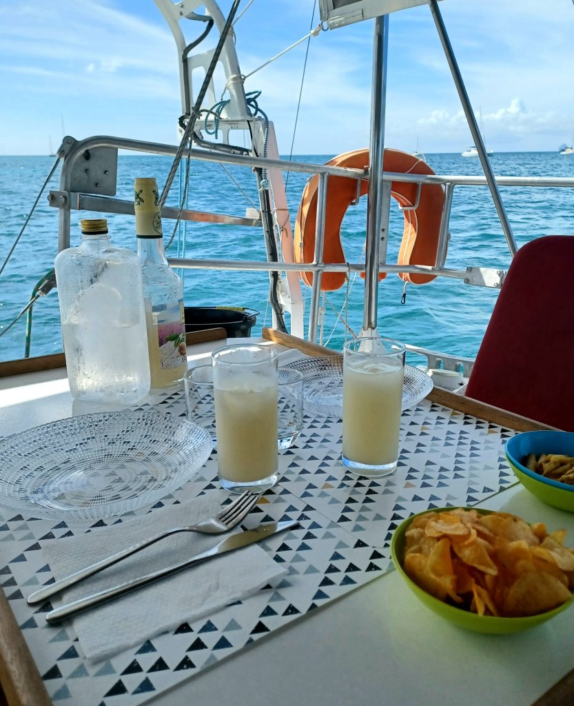 Maintenant qu’Erick a poncé les joints pour finir la réfection du fond du cockpit, on a pu remettre en place la table et manger dehors. Ah c’est mieux ! Un peu d’air ! On a fêté ça avec un verre de vin blanc !