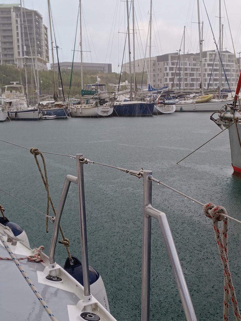 Ciel gris et crachin au réveil mais il fait bon ! On reprend nos habitudes, petit déjeuner tranquille à 7 heures du matin dans le cockpit, il nous reste un tas de choses à faire avant de quitter la Marina vendredi.