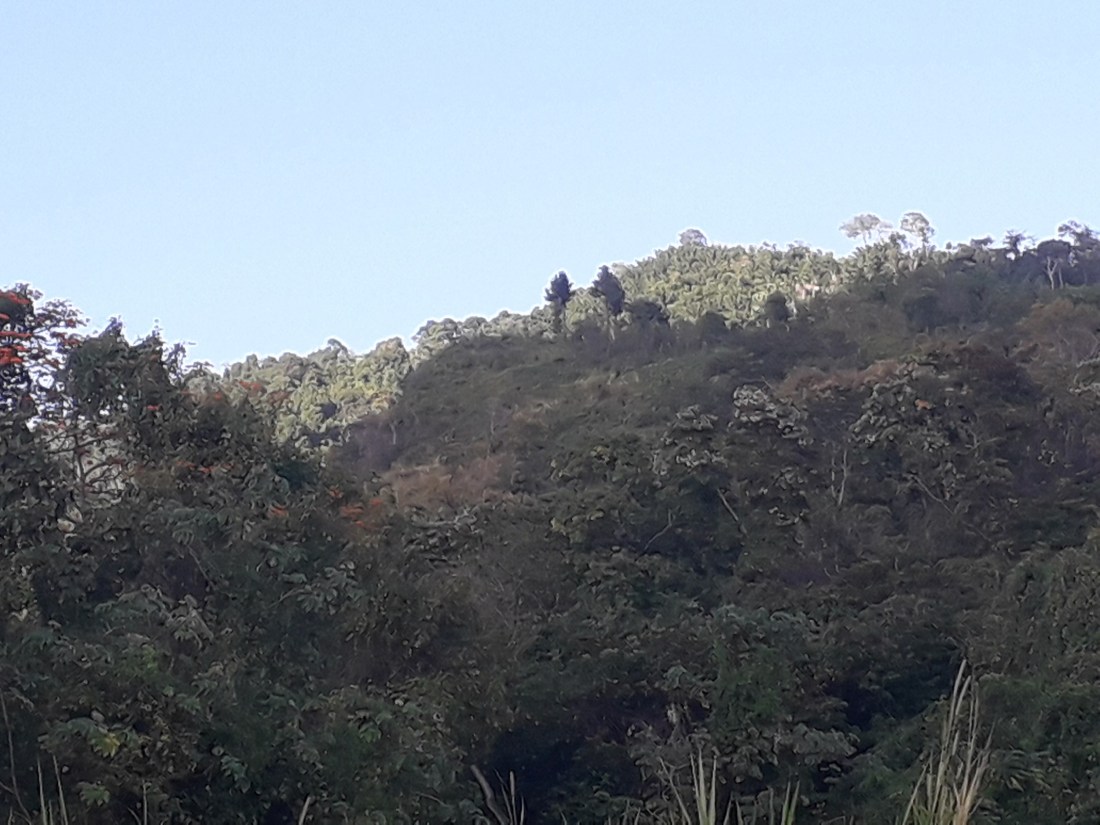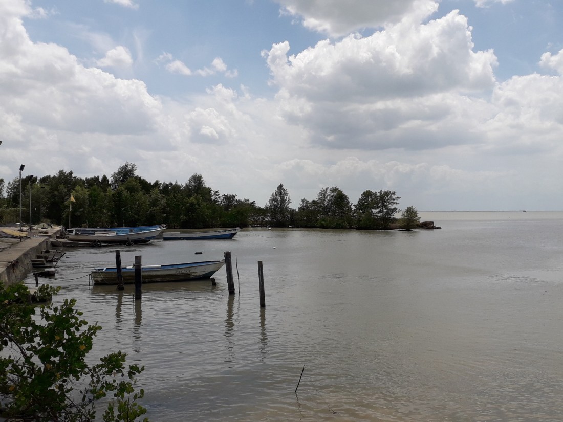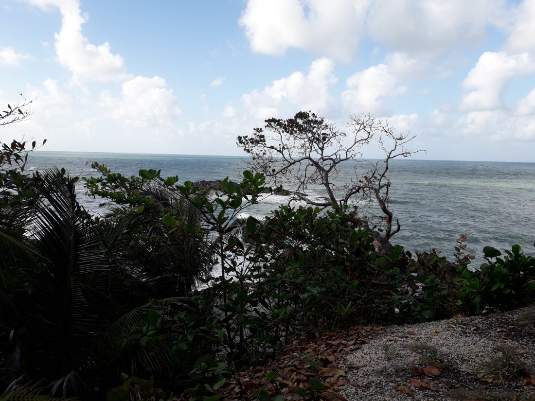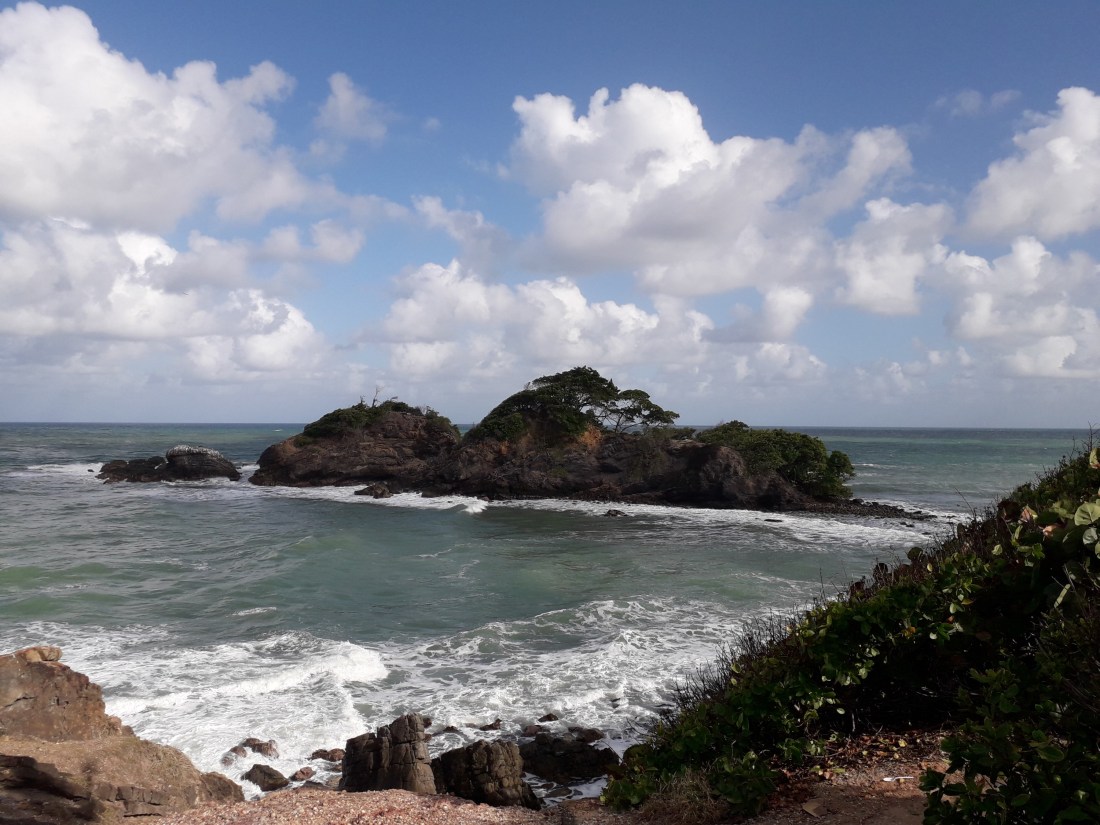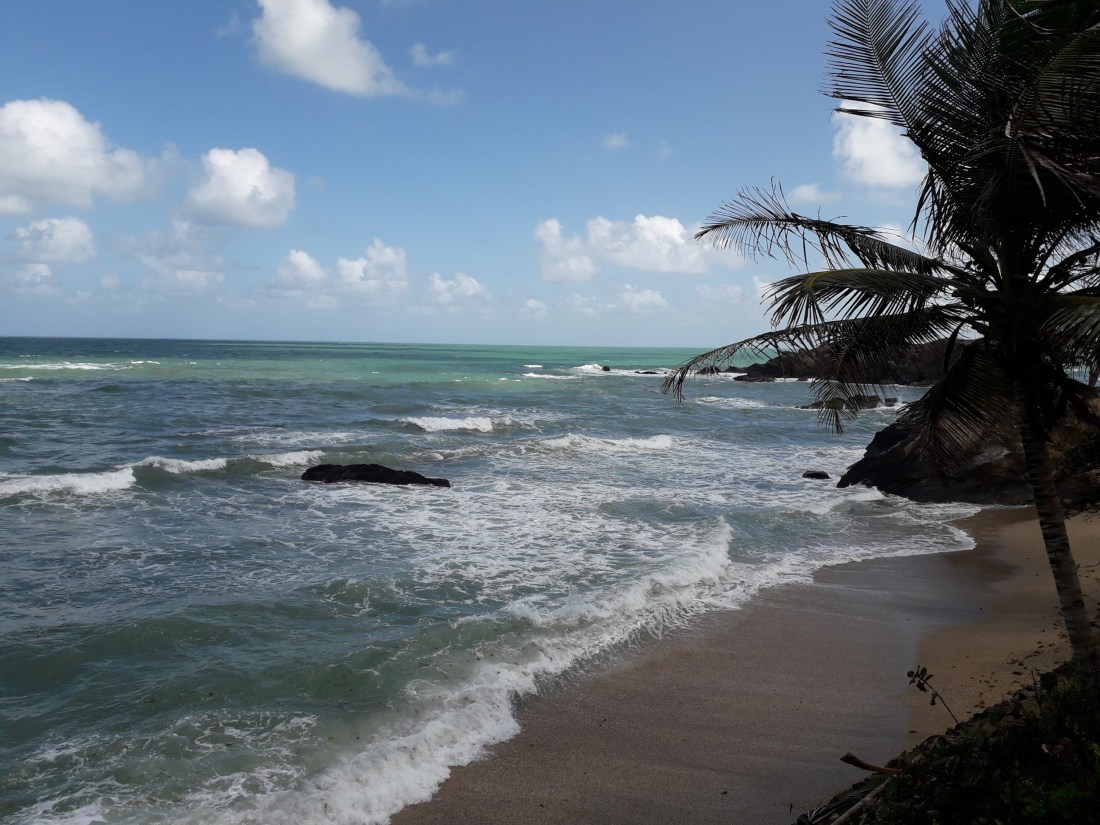 Arima, et puis au bout de nombreux virages, trous, dans une nature un peu tristounette, gâchée par des constructions éparpillées plutôt déglinguées, on arrive sur la côte est, qu’on a longée en remontant vers le nord. Des jolies plages de temps en temps, qu’on aperçoit au milieu des arbres.