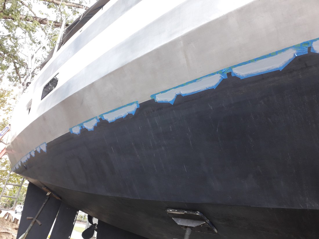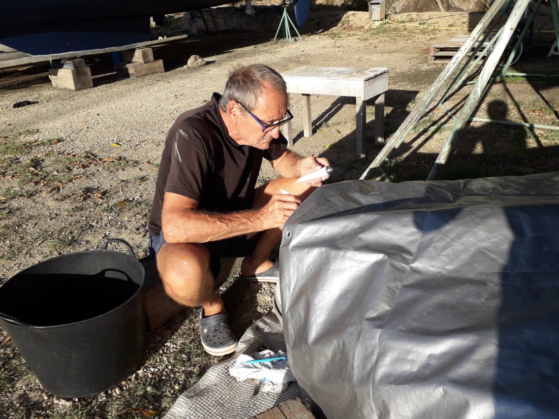 Et voilà, on a repris nos habitudes de bricolage ! Le berceau en inox du groupe électrogène qui s’était déssoudé a été réparé et Erick a pu le remonter. Aujourd’hui, peinture de la bande blanche bâbord. Et c’est tout beau tout propre !