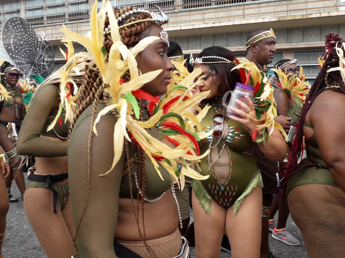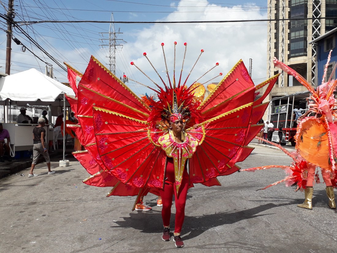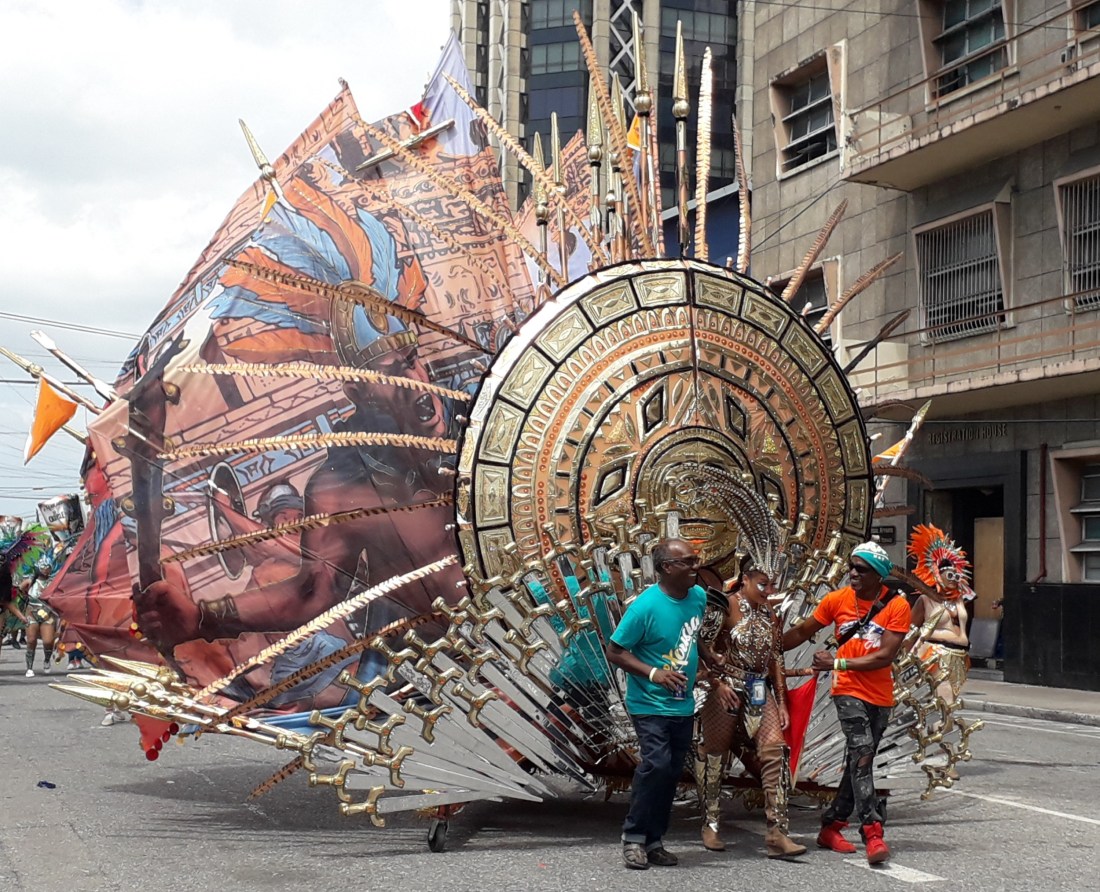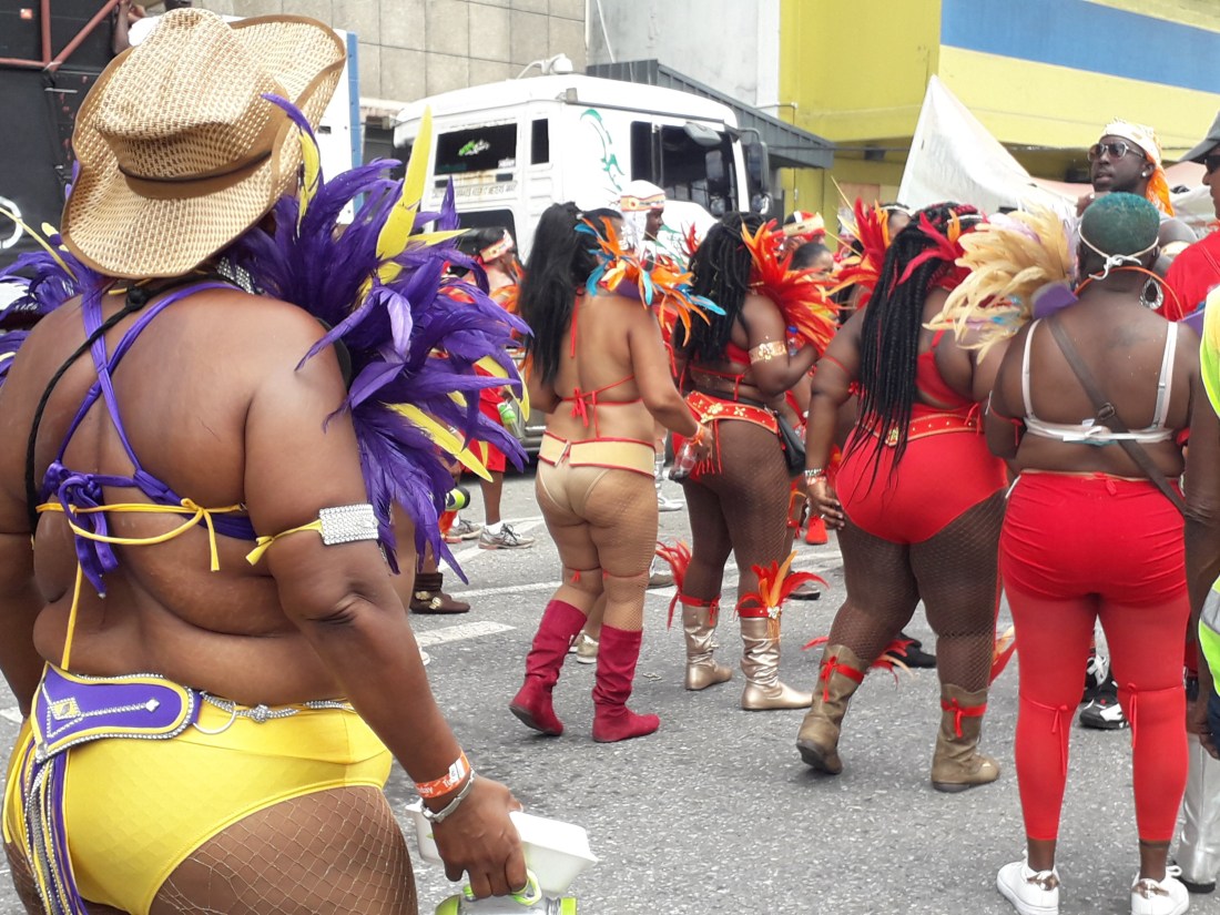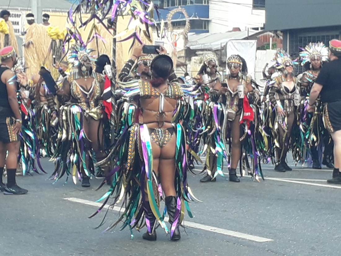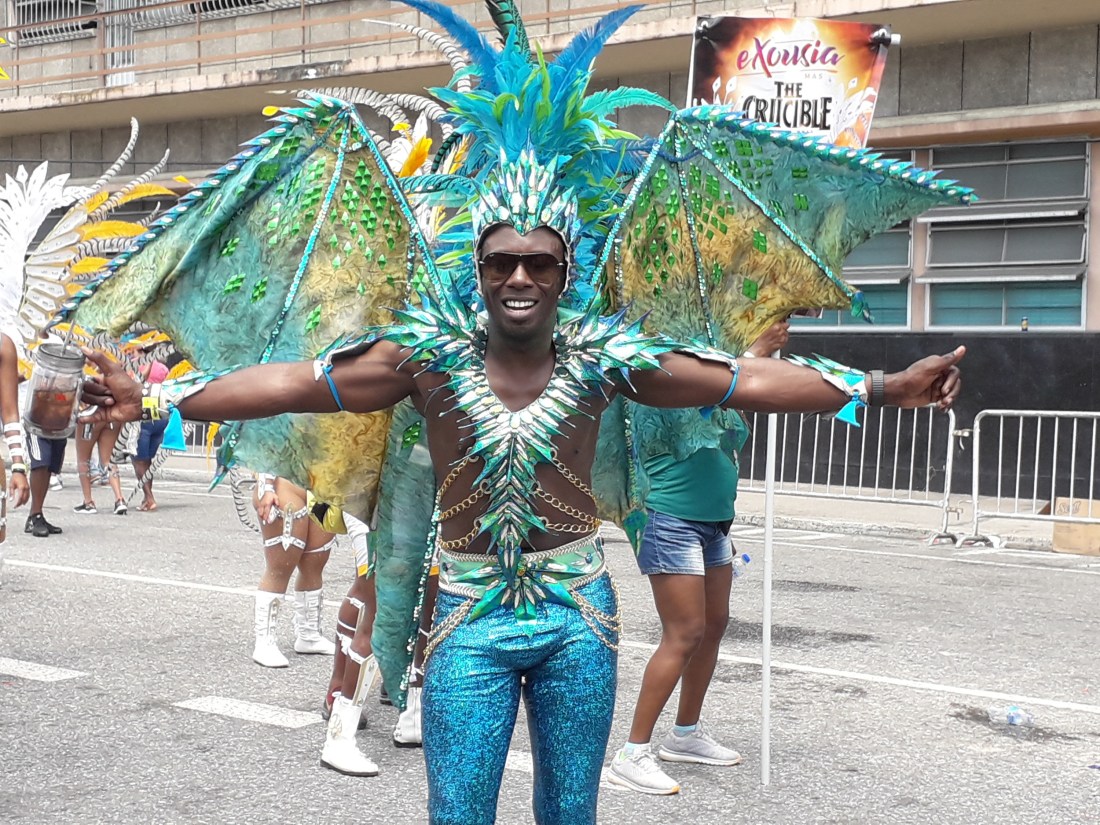 Et pendant plus de 4 heures, on en a pris plein les yeux , surtout plein les oreilles ! … le carnaval de Trinidad est parait il le 2eme après Rio … impressionnant c’est vrai cette débauche de couleurs, de plumes, de musique … et de corps presque nus en veux tu en voilà… et tout le monde à droit à se montrer, les beaux et les moches, les bien foutus et les gros … et je devrais mettre tout ça au féminin car en fait ce sont essentiellement des femmes qui forment le gros du défilé… très peu d’hommes. Et vraiment, #metoo n’est pas encore venu faire un tour ici ! … Ah, un très beau mec cependant pour commencer !