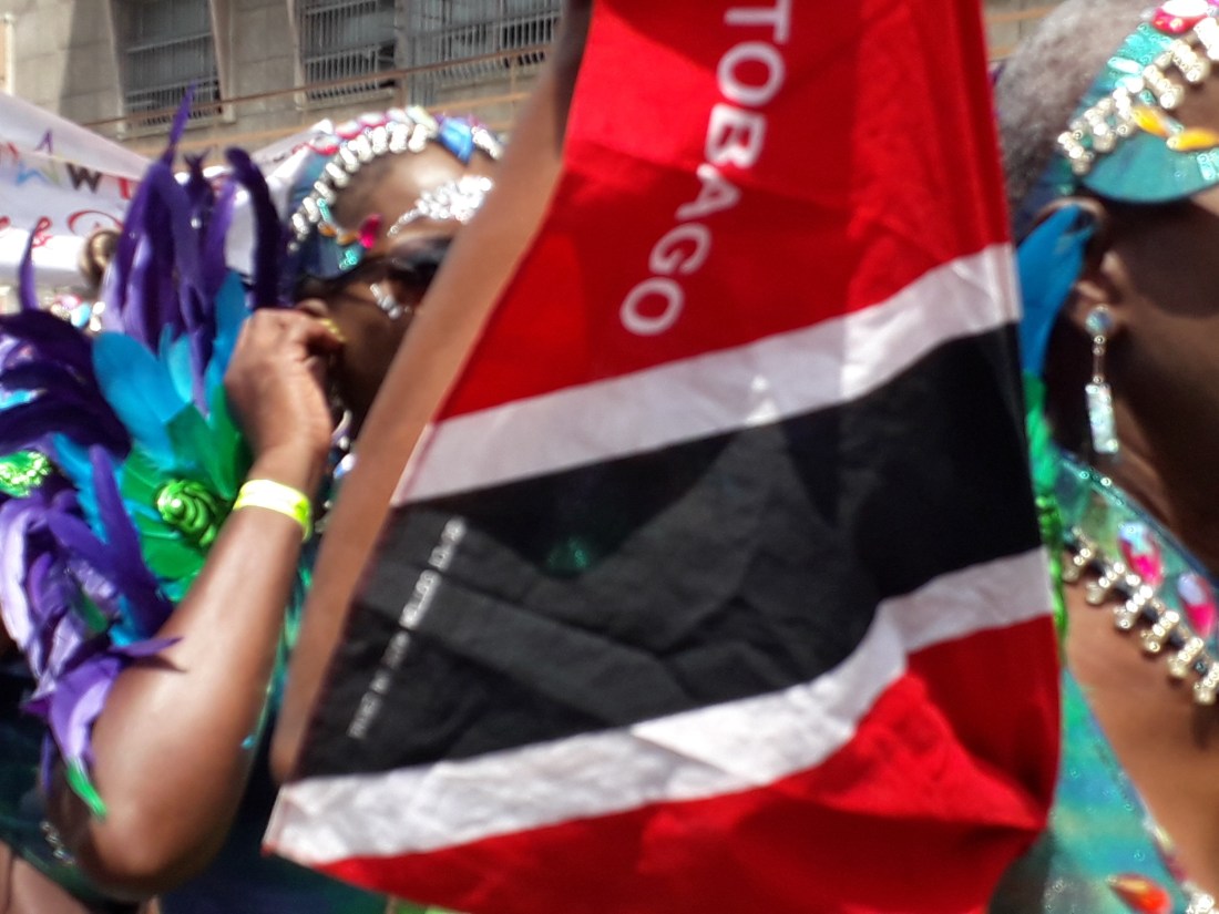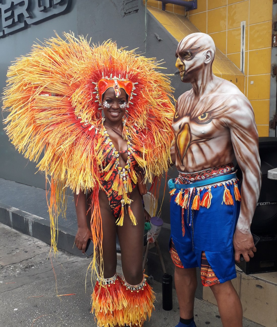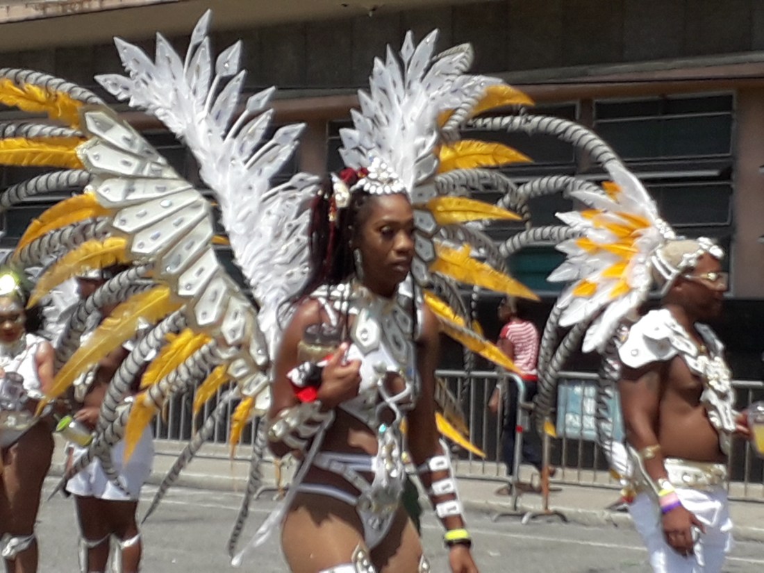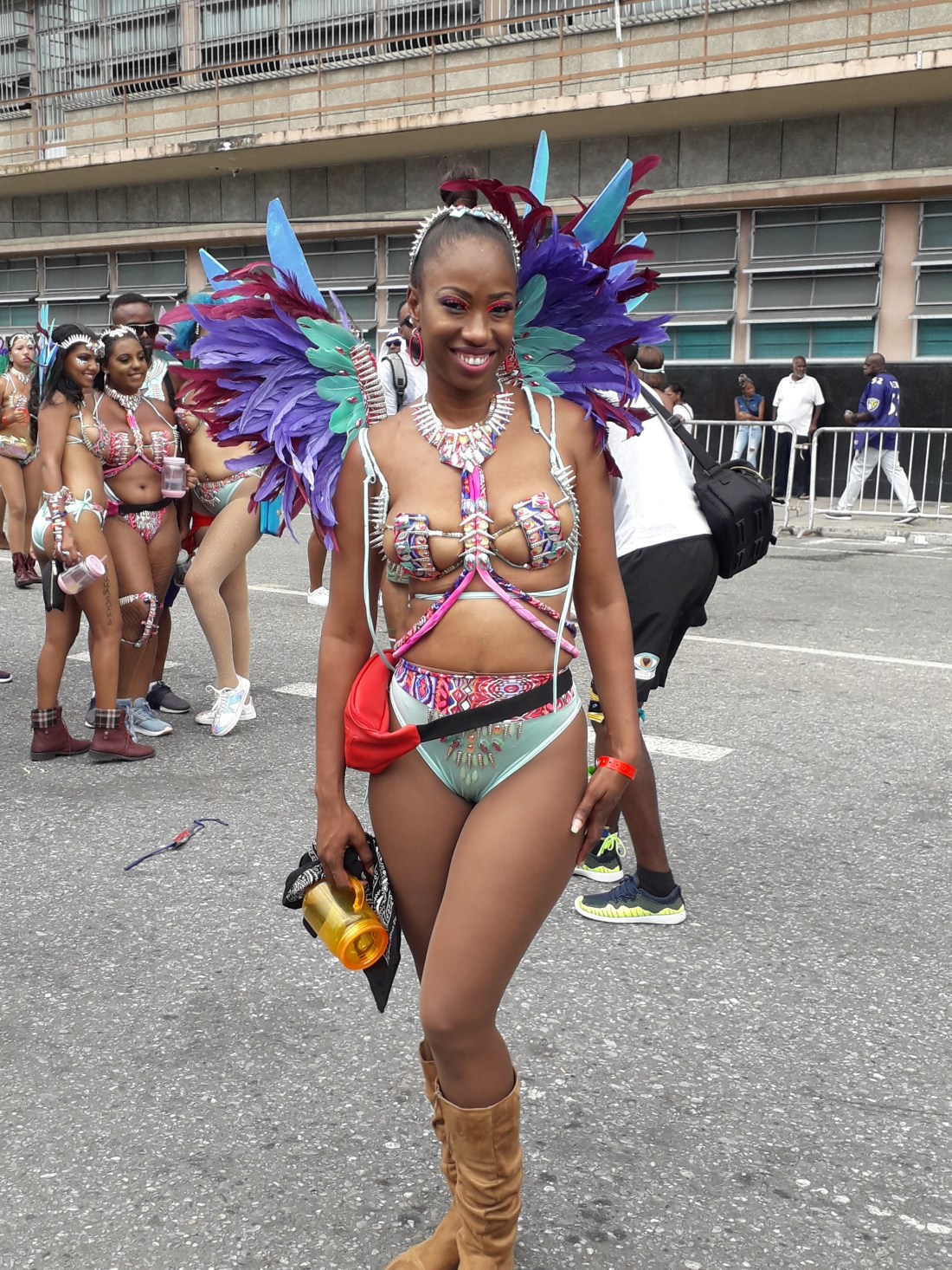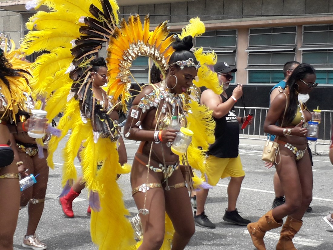 Et pendant plus de 4 heures, on en a pris plein les yeux , surtout plein les oreilles ! … le carnaval de Trinidad est parait il le 2eme après Rio … impressionnant c’est vrai cette débauche de couleurs, de plumes, de musique … et de corps presque nus en veux tu en voilà… et tout le monde à droit à se montrer, les beaux et les moches, les bien foutus et les gros … et je devrais mettre tout ça au féminin car en fait ce sont essentiellement des femmes qui forment le gros du défilé… très peu d’hommes. Et vraiment, #metoo n’est pas encore venu faire un tour ici ! … Ah, un très beau mec cependant pour commencer !