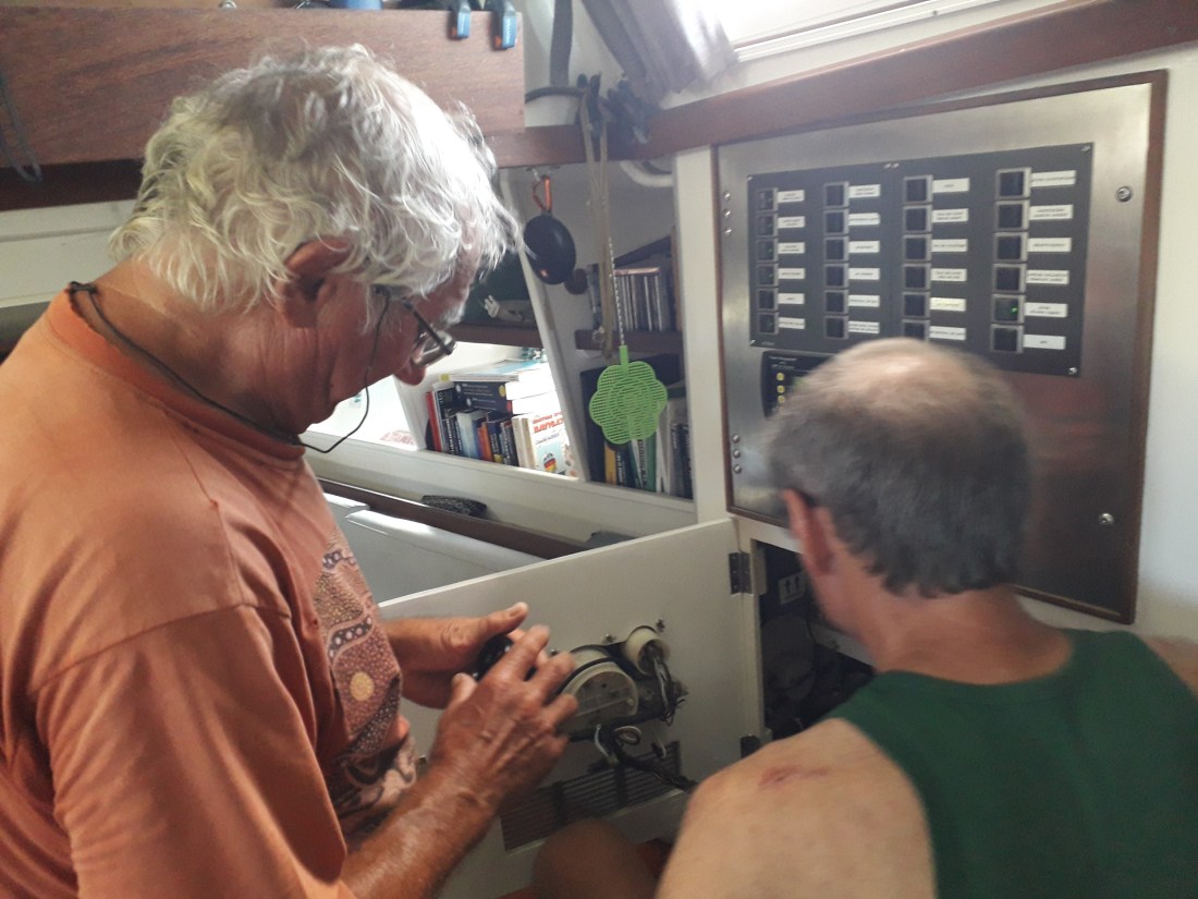 Et puis, pose d’un compteur horaire pour le moteur, sous le contrôle de Michel, le breton du tee-shirt du message précédent, ancien d’EDF, en retraite depuis tellement d’années qu’il a fait avec Claire et son Atlantis, un bateau de Caroff, presque tous les coins du monde. L’ancien compteur horaire n’avait jamais marché, et d’un coup, ce sera plus facile, après, de savoir le temps passé au moteur, sans noter scrupuleusement les heures de mise en marche et d’arrêt et les additionner . Bon, c’était mon job, je vais m’ennuyer !