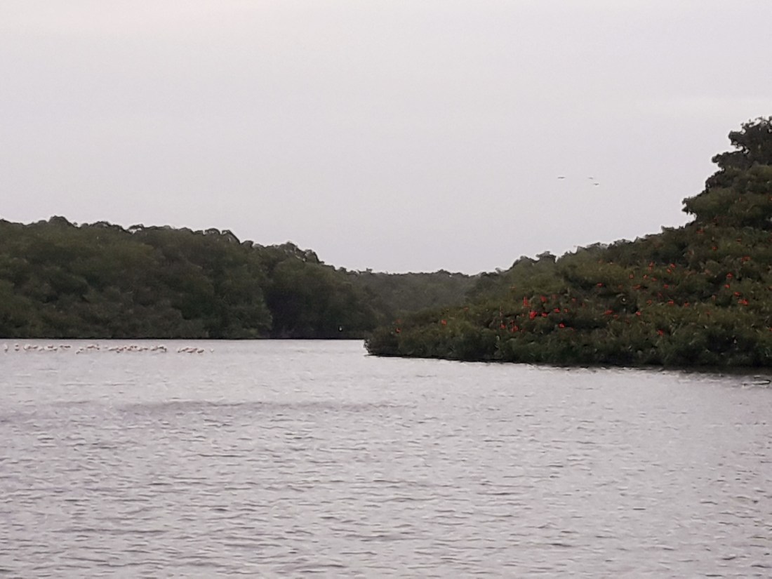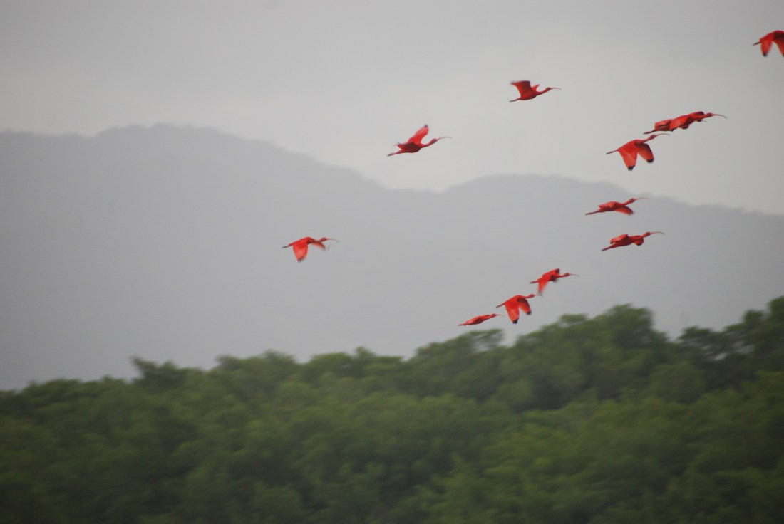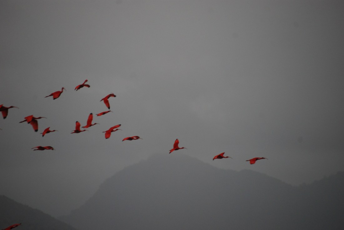 Et le spectacle des ibis rouge flamboyant, qui reviennent en vols successifs pour se poser sur les arbres bien vert ! Chaque vol nous arrachait des ah et des oh, comme si on avait été à un feu d’artifice et ça dure une bonne demie heure ! Trop beau !
