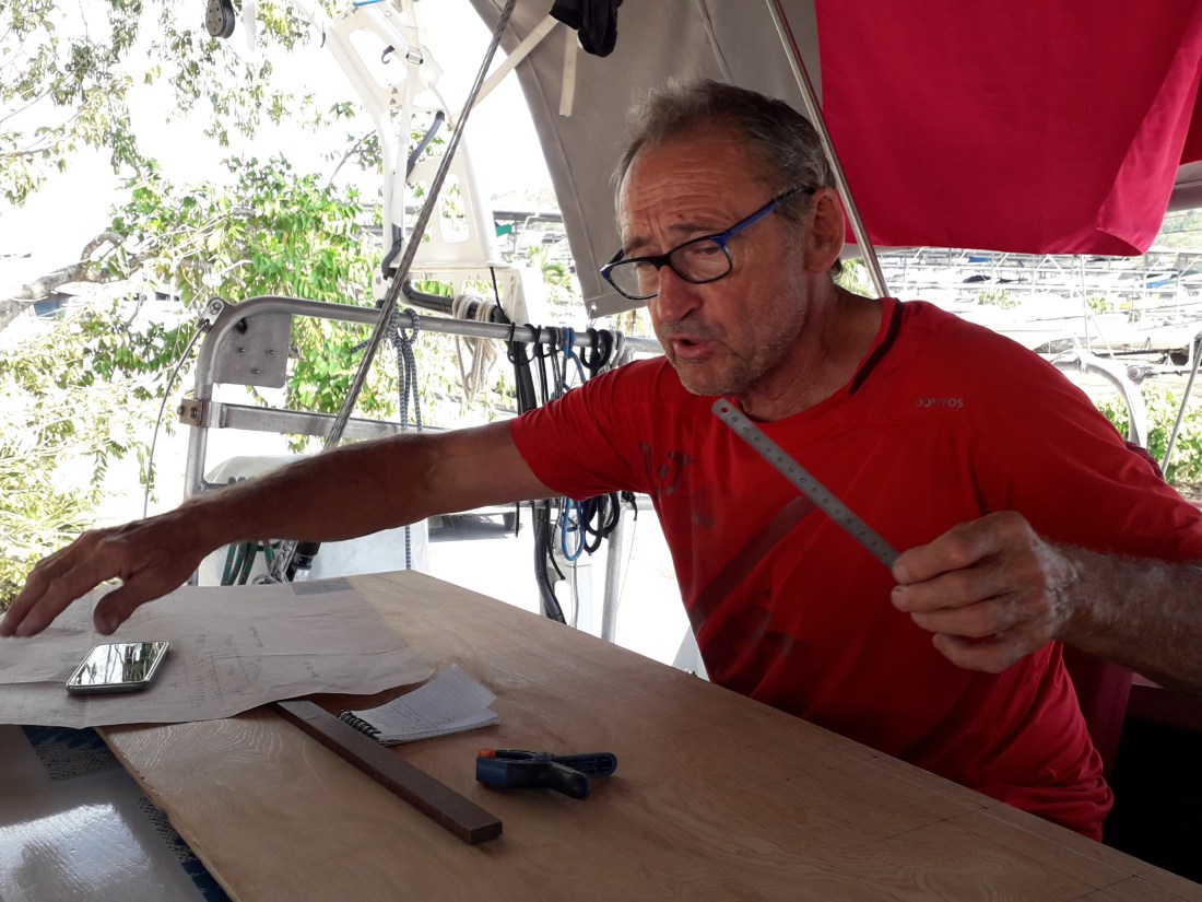 Alors on attend toujours ! … on ne peut pas dire que ce soit pire comme situation. On s’occupe … le panneau de descente est presque fini, Erick a fabriqué les petites glissières en alu qui permettront qu’il ne s’en aille plus ce qui était fort désagréable et plutôt pas trop sûr… Pour moi, les planchers sont presque finis, il me reste le carré arrière.
