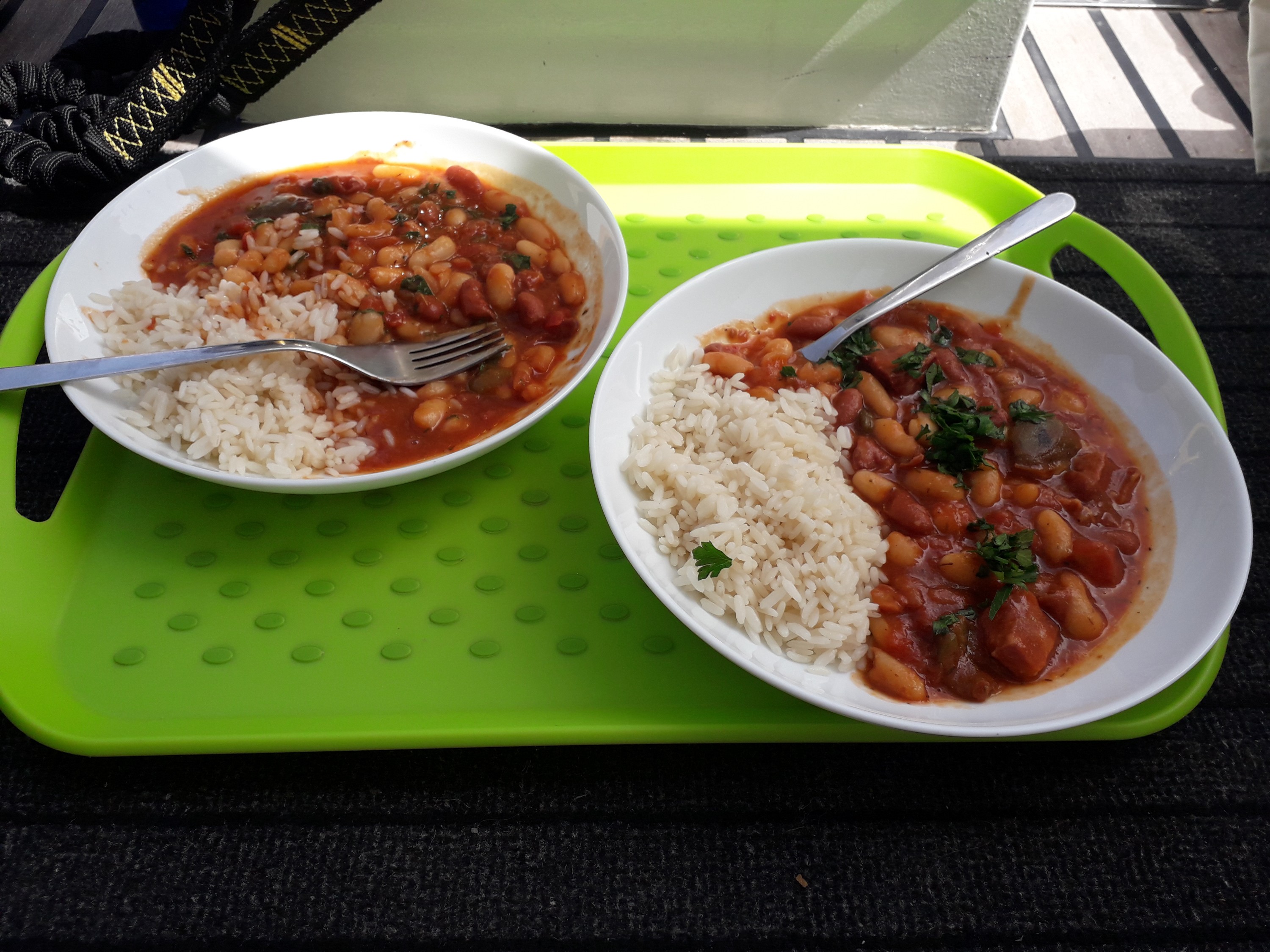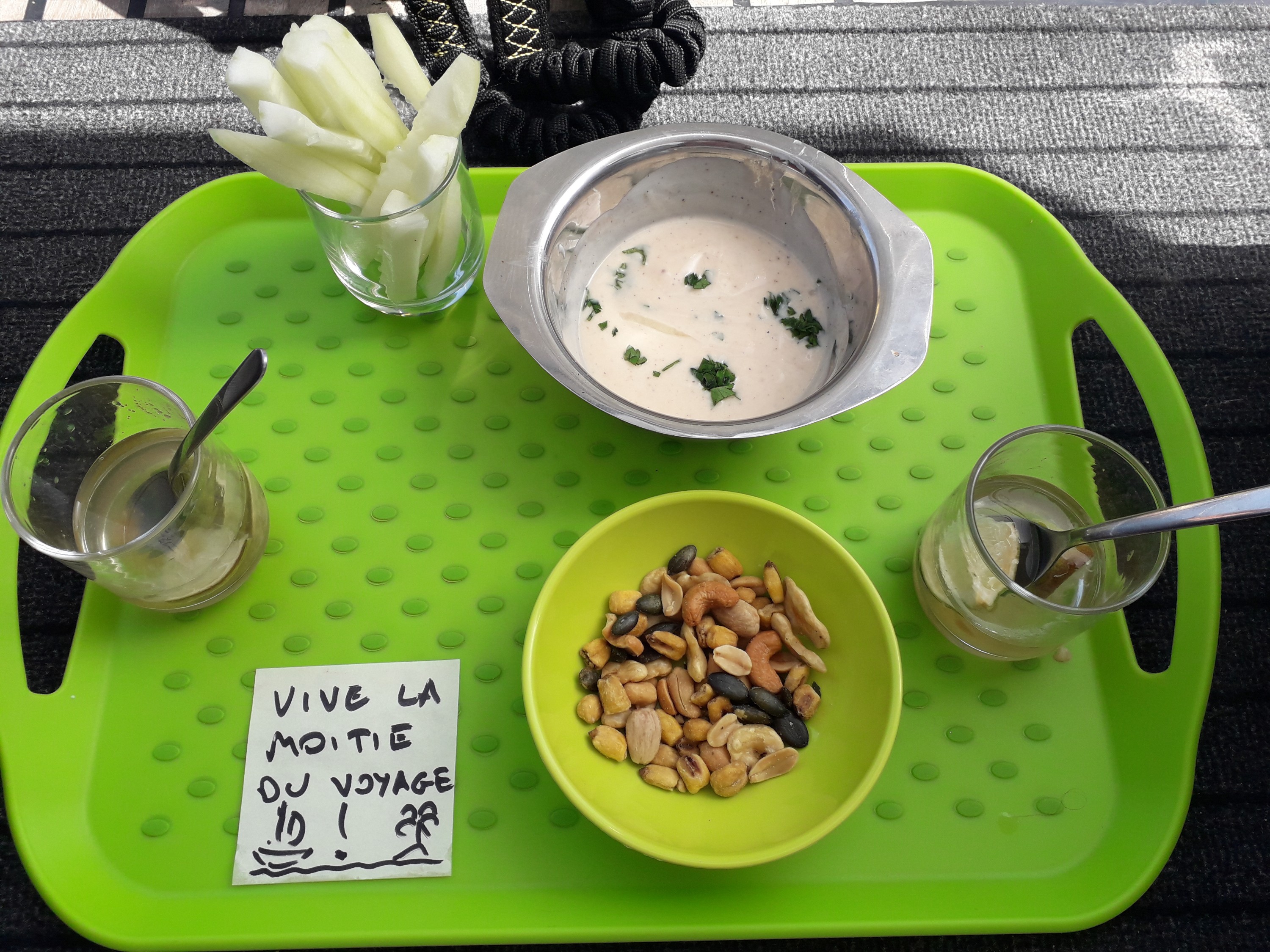 Hier soir, on s’est fait une soirée entre français ! Entre francophones plutôt car il y avait un couple de Canadiens de Montréal, un couple de Suisses et 4 couples français. Soirée à goûter la fraîcheur, sur des tables de pique-nique au bord de l’eau, à déguster les salades apportées par chacun et à faire des comparatifs de planteurs, chacun ayant fait son style de punch !