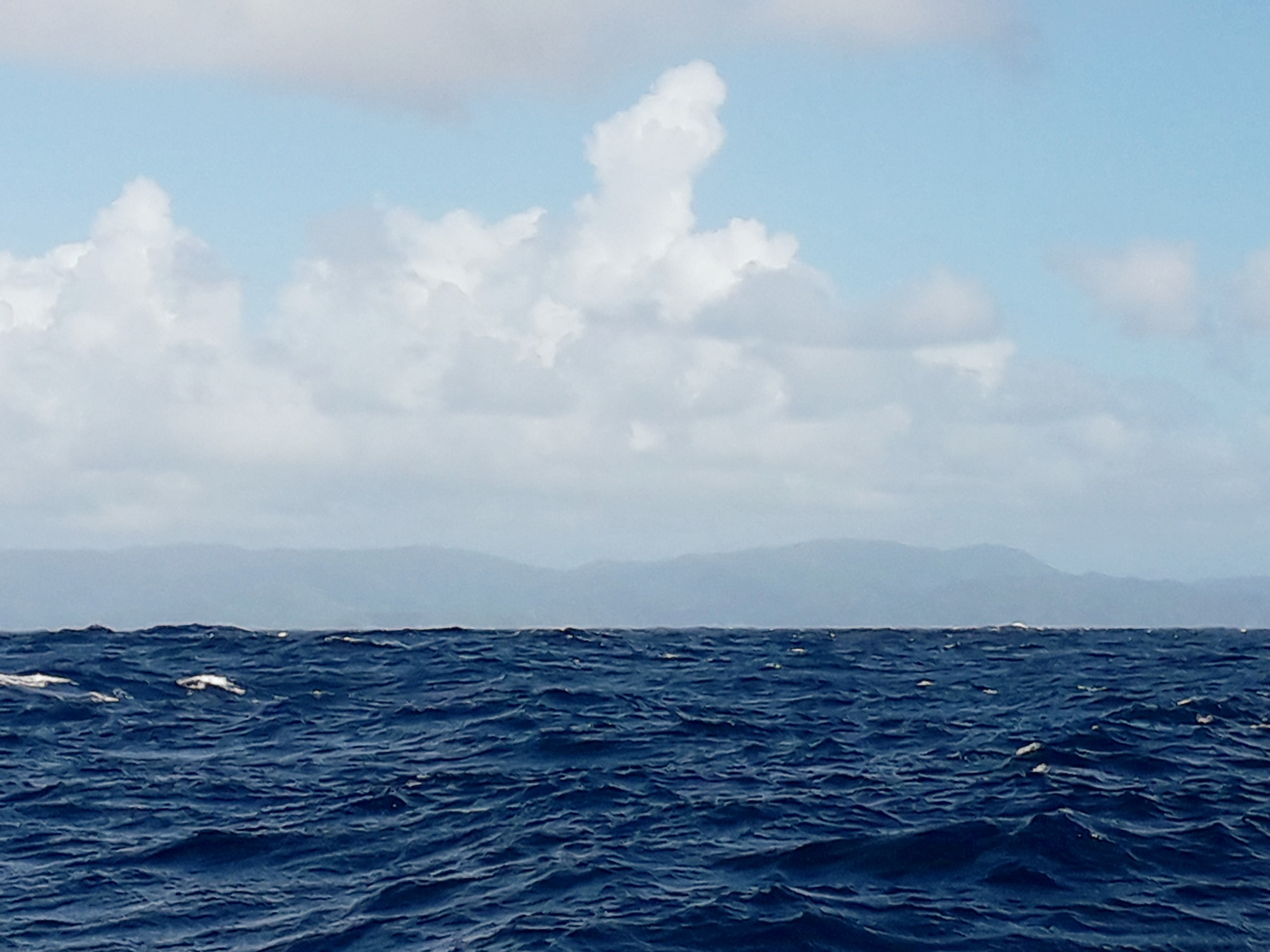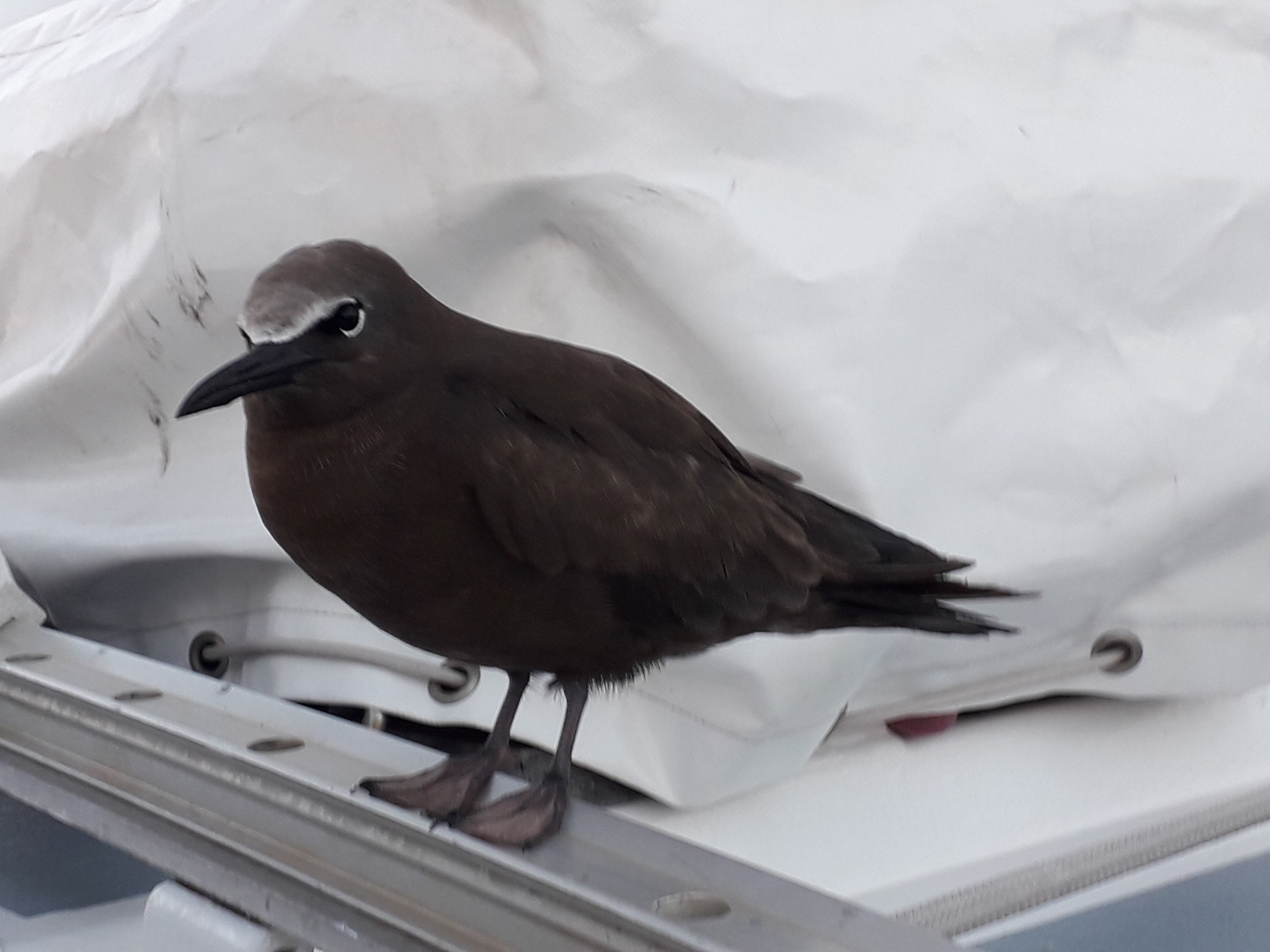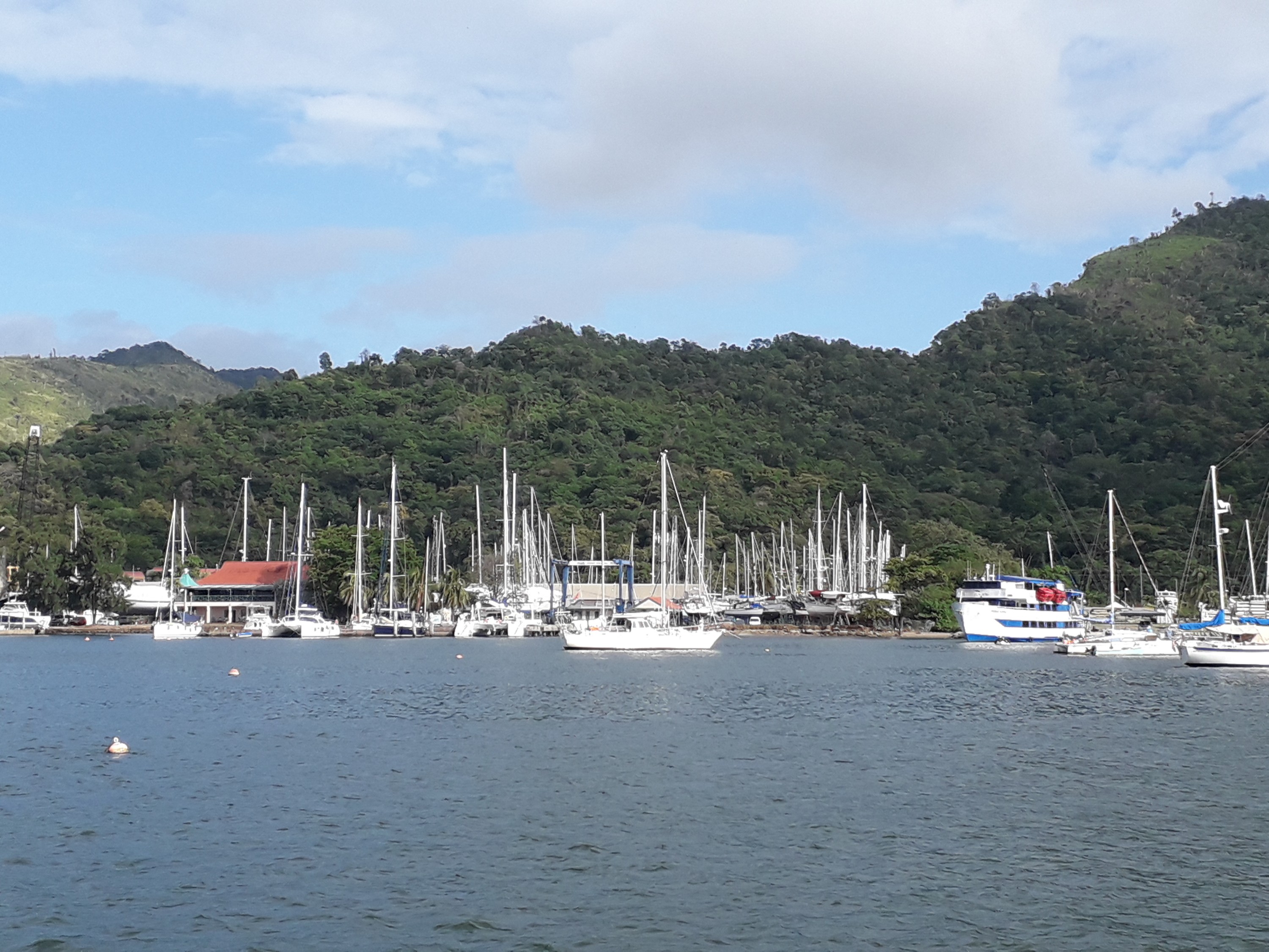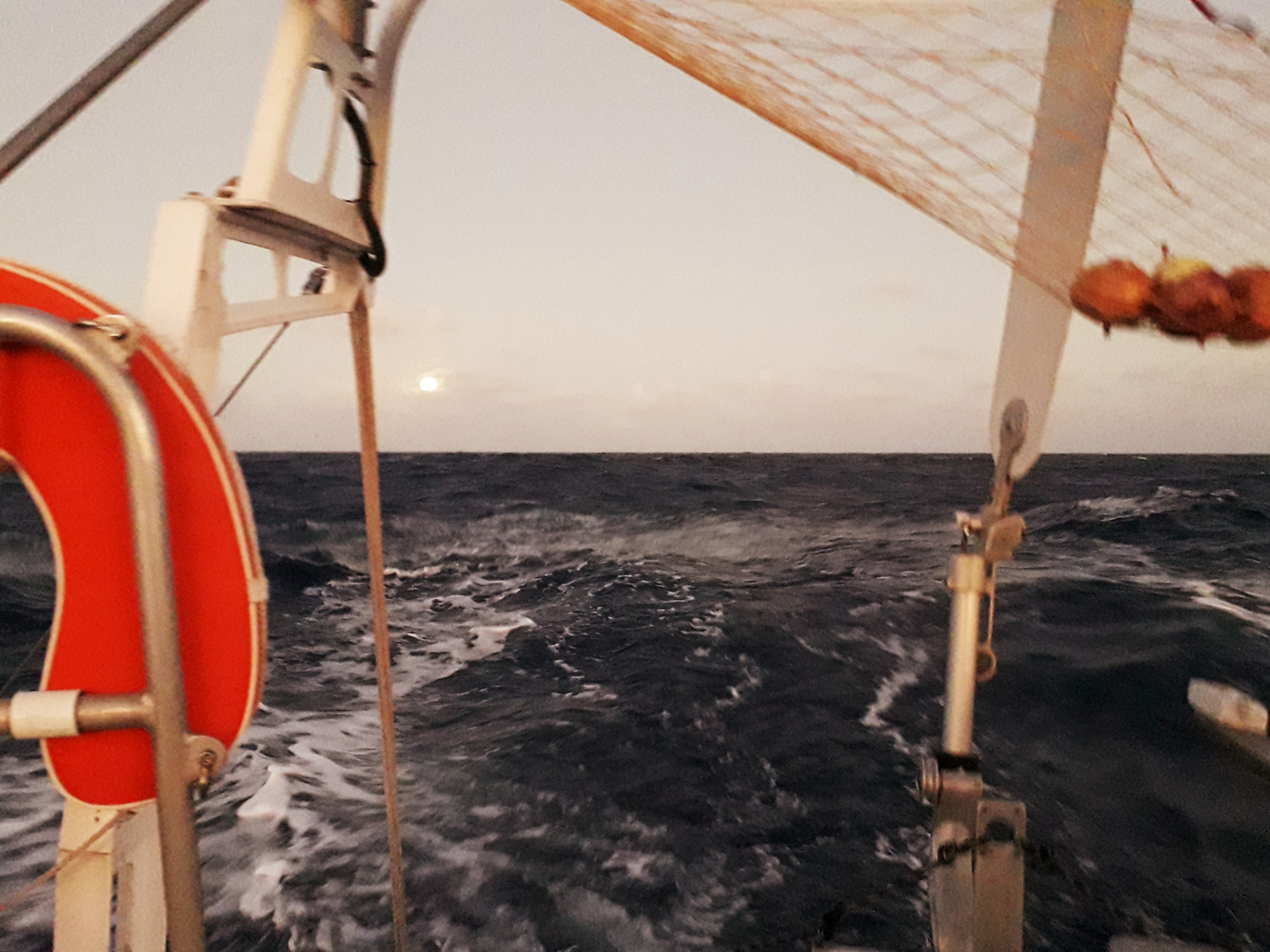Et voilà, on est arrivés et on peut vous souhaiter, avec du retard, une très bonne année 2020 ! Ne vivez que le meilleur de vos envies ! On est jeudi … on est arrivés dans la nuit de dimanche à lundi. Et pas eu le temps depuis de me poser un peu pour faire un message ! … une vie de galériens ! … la douane, l’immigration le premier jour, et ça prend presque la journée ! Et puis prendre contact avec le chantier, revoir la date de sortie du bateau, s’habituer au coin , trouver où on fait les courses … bref, il faut prendre ses marques ! Les journées passent vite, le soir arrive très vite et à 17h30, il fait presque nuit … et puis aussi, il a fallu récupérer un peu avant d’être un minimum efficaces ! … les 2 premiers jours, on était au mouillage, depuis hier, on est au ponton, face au bâtiment d’accueil du chantier, une belle maison de style coloniale, un café sympa, le Zanzibar, au 1er étage et le bureau du chantier où on s’inscrit. Et puis, en bas, 4 petites chambres à louer et la laverie. La traversée s’est bien passée… 16 jours. Pas si mal, mais on aurait dû faire bien mieux si on n’avait pas eu 3 jours sans vent ou presque , au début et puis après, pas trop de vent non plus, 20- 25 noeuds au mieux ! Mais pas à se plaindre ! En pensant à Cristine, notre équipière spécialiste du moit-moit, qui veut toujours tout partager en deux, on a fêté la moitié du voyage Avec un petit punch en plus ! Mais, en fait, cette traversée, c’était pas du tout ce que j’imaginais ! Je voyais de belles journées à lire au soleil, une longue houle qui nous aurait poussés… non non, pas du tout ! Cela a été a la place, une mer très bousculée qui nous chahutait et ne nous donnait pas trop la possibilité de flemmarder ! La préparation de l’avant dernier petit-déjeuner a même été un exploit sportif ! Tout valsait à peine on lâchait les objets ! Il faut dire que, pendant toute la traversée, chaque jour, au petit-déjeuner, c’était œufs au plat, saucisses et jambon grillé, alors des fois il fallait s’accrocher pour tout préparer ! … cette mer, c’était un peu fatigant, et les nuits des fois pas faciles pour dormir tranquille ! Les journées cependant se passaient assez bien … Mina est restée sans bouger de sa couchette pendant les 8 premiers jours , juste un petit tour à sa caisse, boire un peu sans doute , et puis c’est tout et à partir du 9eme jour, ça y est, elle avait retrouvé la forme et l’appétit ! Sinon, pas âme qui-vive avant le 11ème jour où nous avons aperçu au loin notre premier cargo ! On n’est jamais content faut dire ! On n’aime pas , (moi du moins !)voir les cargos de trop près et quand on n’en voit pas, ils manquent ! … pas de cargos, pas de baleines, quelques dauphins qui nous ont accompagnés un moment, le 2ème jour, et puis, hop partis, plus rien, une petite poignée de poissons volants qui venaient s’échouer, chaque nuit sur le pont …assez gros un matin, suffisamment pour que je fasse des rillettes de poisson délicieuses… et, voilà, c’est tout, seuls au monde ! Même pas une traînée d’avion dans le ciel pendant 15 jours ! … Ah, aussi, un oiseau qui est venu se poser sur le pont, le 14ème jour, pendant la nuit. Un bel oiseau noir, avec un collier blanc, des pattes palmées, un long bec noir. Même pas farouche, il semblait épuisé … il a dormi toute la nuit, le bec enfoui dans les plumes, à copieusement sali le pont d’excréments à jets continus et ouf, il est parti au petit matin. Et puis, vers la fin, un cargo, un autre, des vols d’oiseaux … on sentait la terre approcher. Belle lune pendant presque toute la traversée pour éclairer nos nuits et c’était un plaisir. Lever de lune le 10 janvier, jour de la pleine lune.