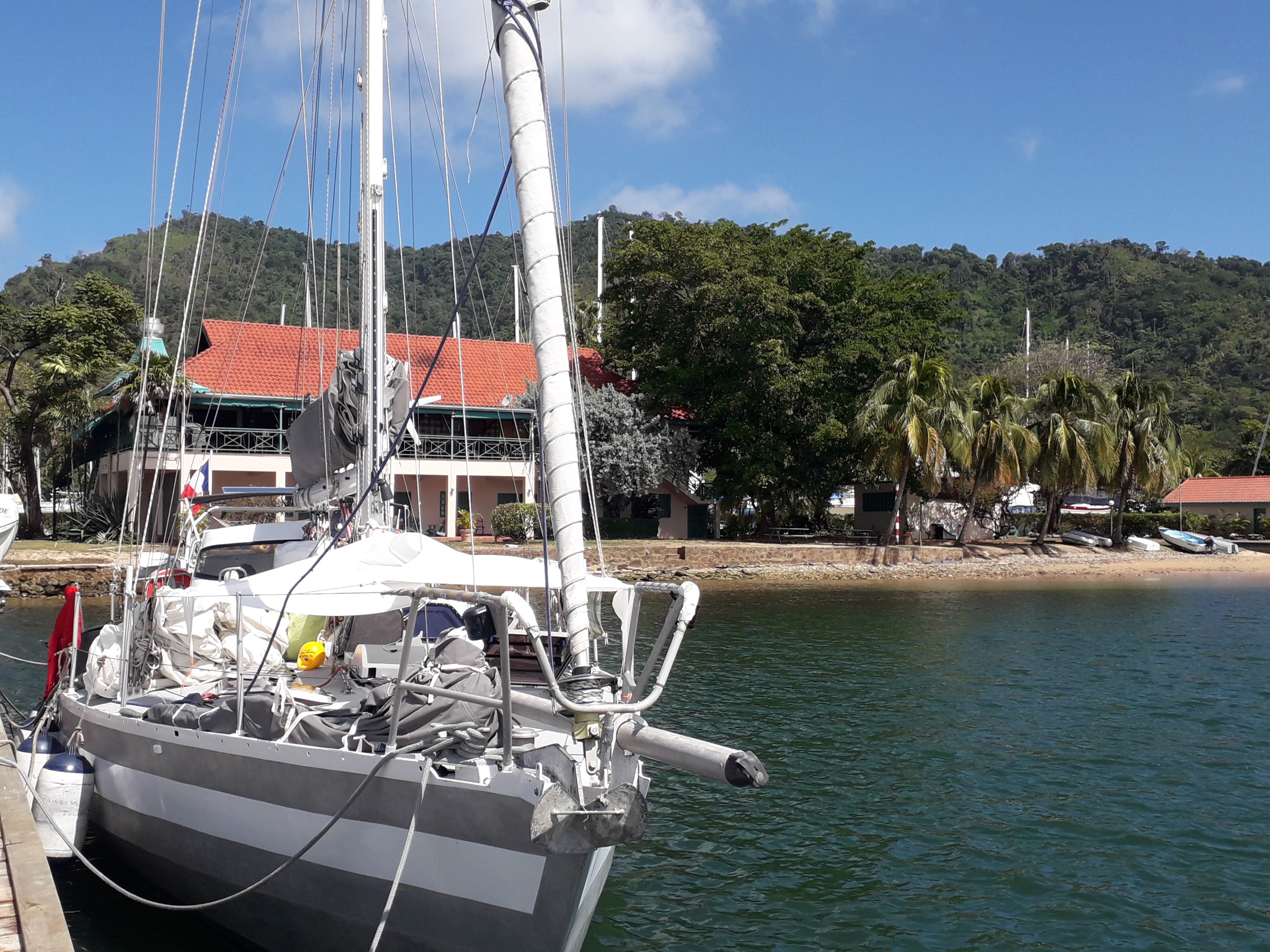 Et puis, dernier lever de soleil le matin du 12Et vers 9h, terre ! On voyait Tobago !Toute la journée pour se rapprocher, passer entre les deux îles, longer la côte nord de Trinidad … le soir tombait on apercevait au loin le dernier cap à passer avant de faire route vers Chaguaramas. Heureusement le vent s’était calmé et nous avons pu arriver dans la baie pour mouiller sur une belle eau lisse, brillante avec la presque pleine lune qui venait de se lever … et voilà, il était minuit et on était bien contents de jeter l’ancre et d’aller dormir enfin tous les deux ensemble dans un bon lit avec des draps tout propres ! Les occupations pendant la traversée c’était un peu de lecture, beaucoup de sommeil, à tour de rôle toute la journée et les quarts qui se sont bien passés, 3 heures chacun entre 20h et 8 heure. Sinon, Erick lui passait l’essentiel de son temps, dans la jupe à l’arrière, à régler le régulateur d’allure. Super, il nous a permis de traverser sans qu’on touche à la barre et en silence, par rapport au pilote automatique, sans consommer surtout d’électricité. Génial…mais c’était au prix d’une surveillance et de réglages continuels … merci Oscar. Merci Erick ! … pour moi, cuisine … et on a bien mangé… un peu de couture, je me suis fait un beau débardeur dans un reste de rideau d’Ikea ! Et puis une housse pour un des siège de cockpit pour qu’on puisse le laisser dehors malgré l’humidité la nuit et rendre les quarts bien plus confortables ! Voilà , c’était une sacrée expérience ! … on met le bateau au sec, lundi à 13 heures. A partir de là, on pourra démonter la tête de dérive et voir ce qu’on peut faire pour réparer. On n’a pas encore l’esprit bien serein et on n’en est pas près sans doute ! A suivre !