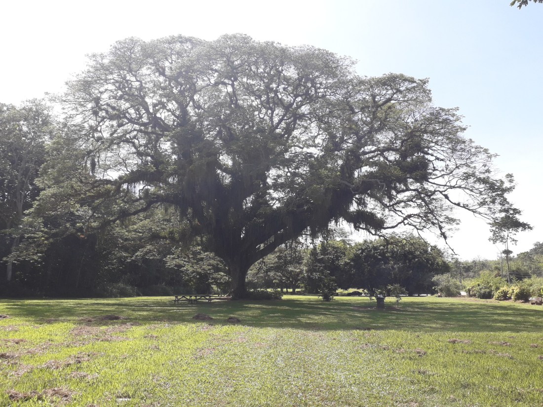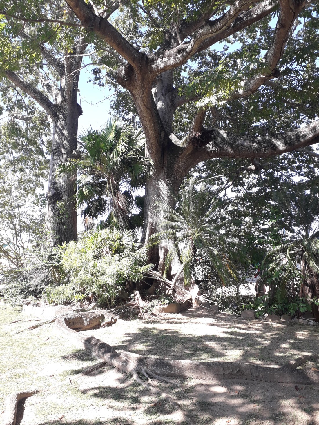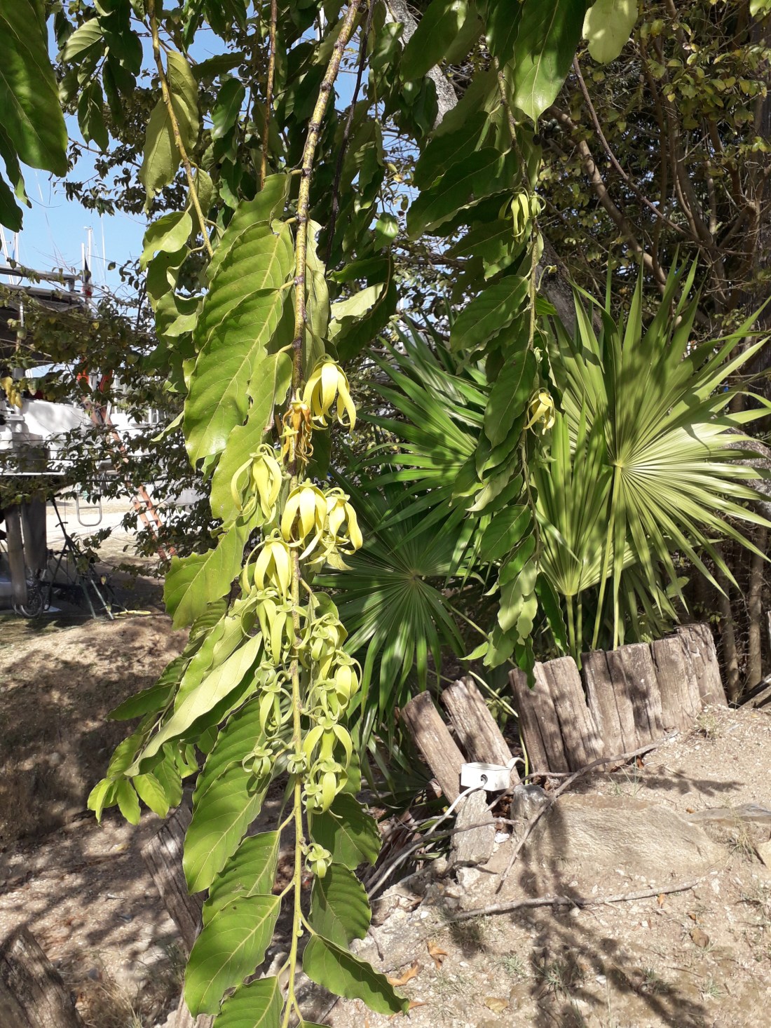 Il y en a deux d’ailleurs, côte à côte, très beaux, hauts, bien droits et à côté, il y a un ylang ylang. C’est avec ces fleurs jaunes qu’on fait l’essence d’ylang ylang.