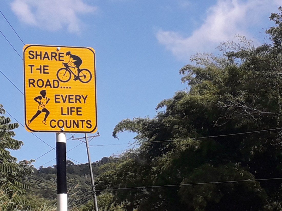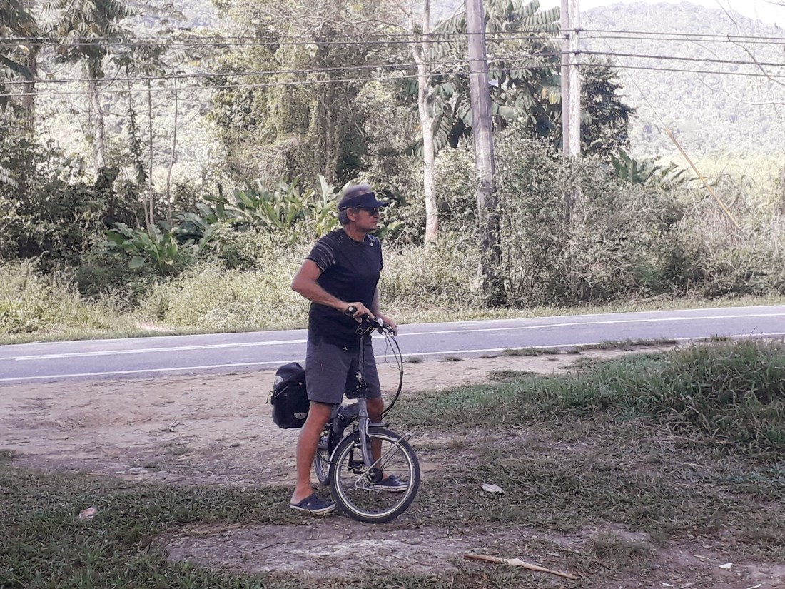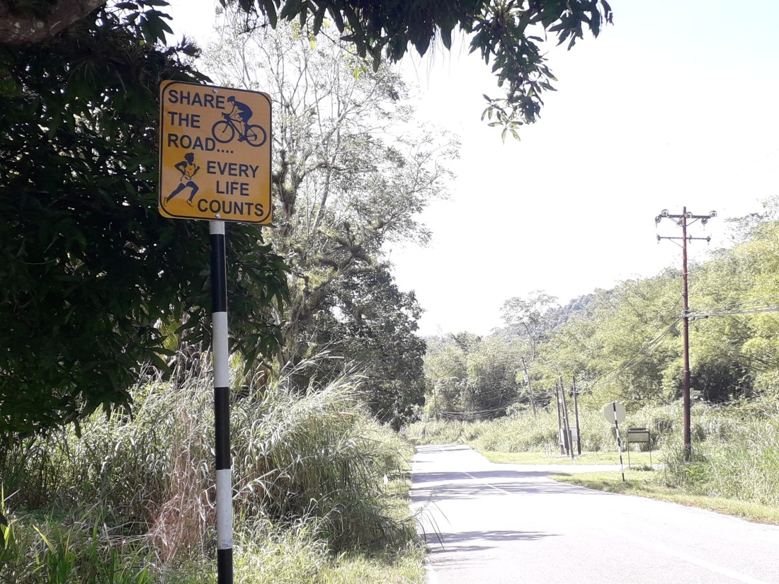 Hier, c’était mieux, on est allé jusqu’à une plage, de l’autre côté de la presqu’île. 10km environ , en partie le long de la grande route qui va à Port of Spain, heureusement, il y a une espèce de bande d’un côté qui ferait un peu piste cyclable. Et puis après, on quitte la route pour une petite route qui traverse la barrière montagneuse par une vallée très verdoyante pour arriver au bout à un cul de sac et la plage .
