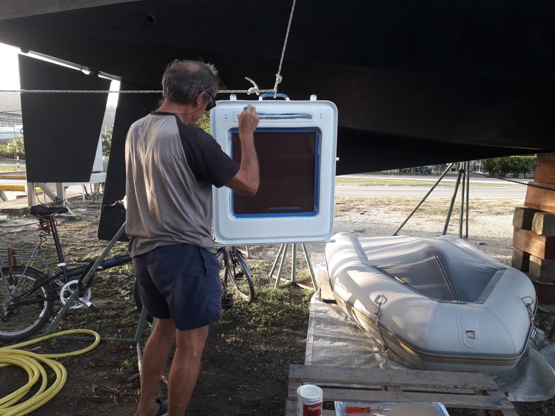 Dimanche très chaud. On a continué ce matin nos bricolages, ponçage toujours pour moi … et Erick , lui, s’est attaqué à trouver une solution pour qu’il n’y ait plus d’entrées d’eau au panneau de descente. Il va falloir peaufiner le travail , pour l’instant ce n’est pas parfait.