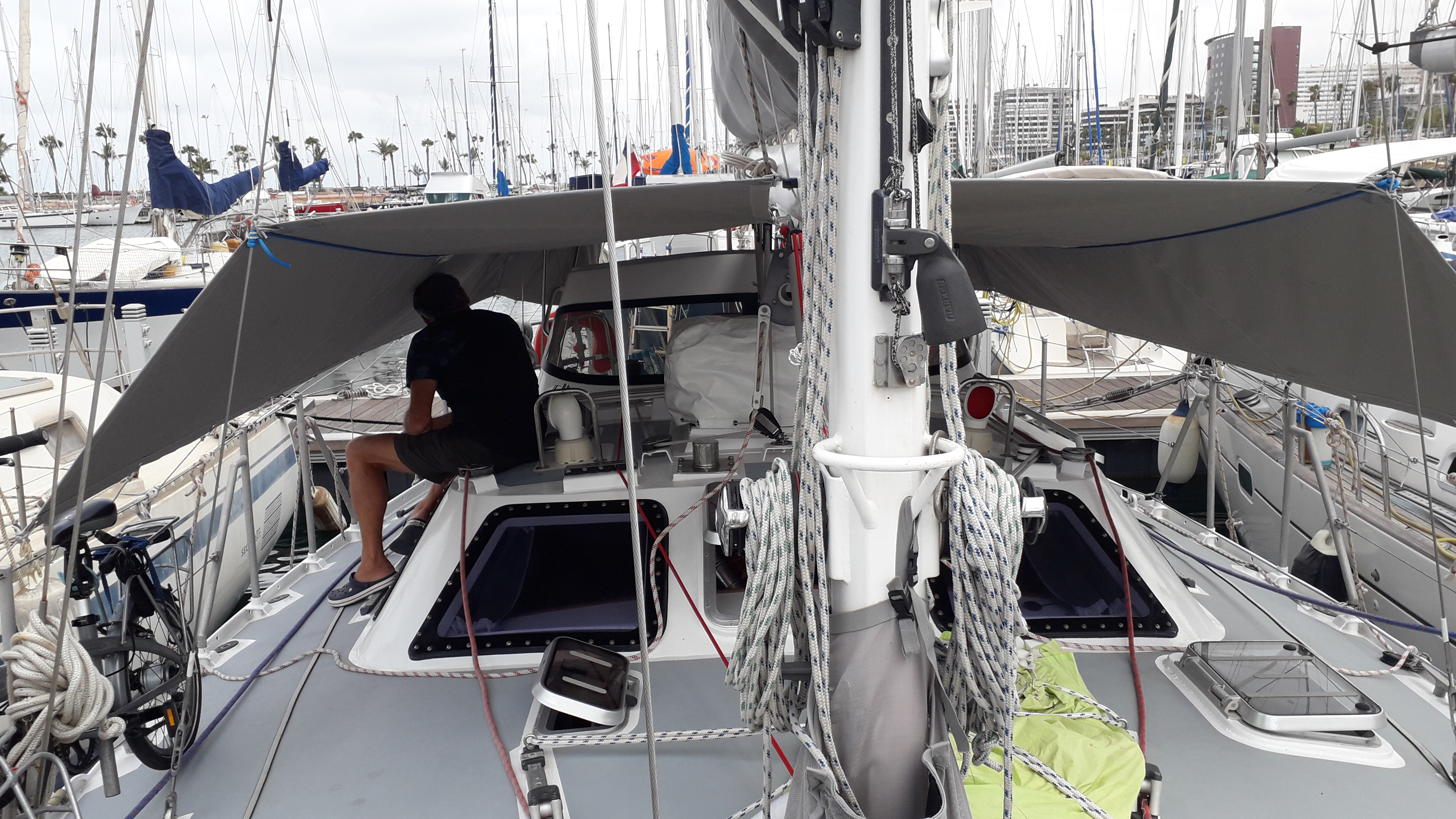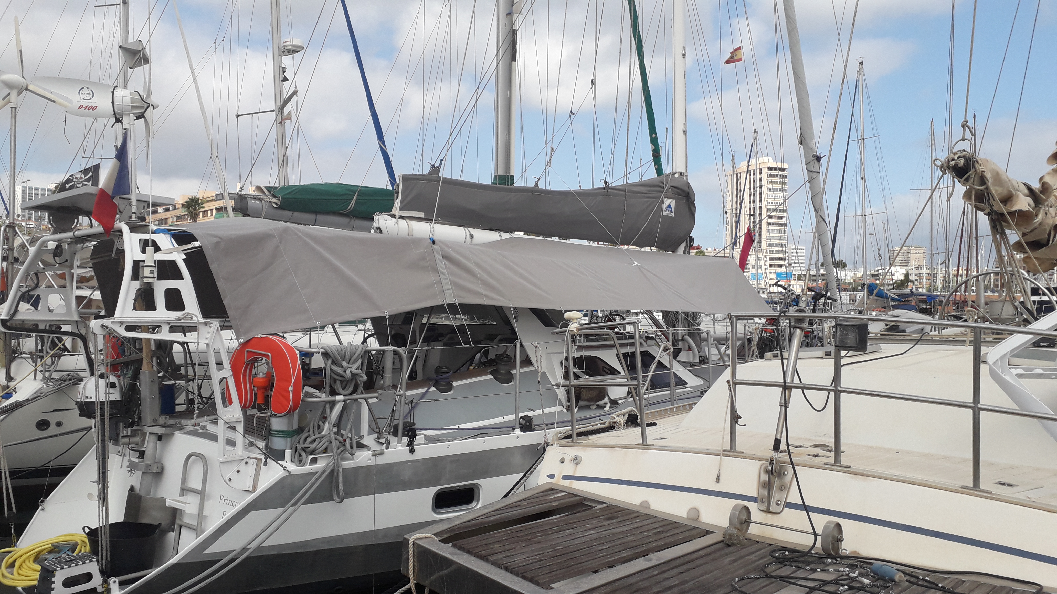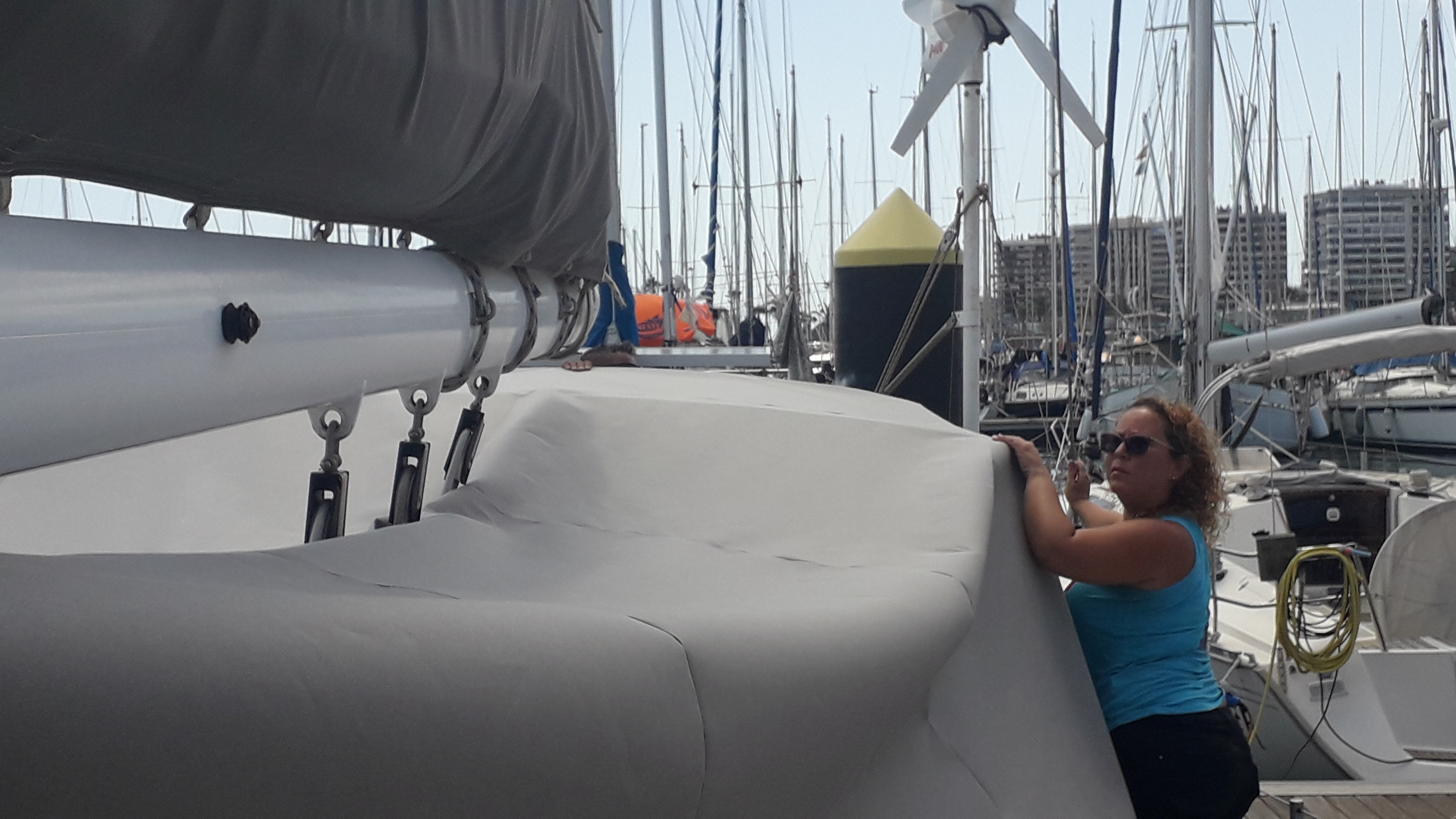 2eme essayage hier du taud . Il est super et dès qu’ il est en place, d’un coup, il fait frais dans le bateau. Mmmm ça va être bien !