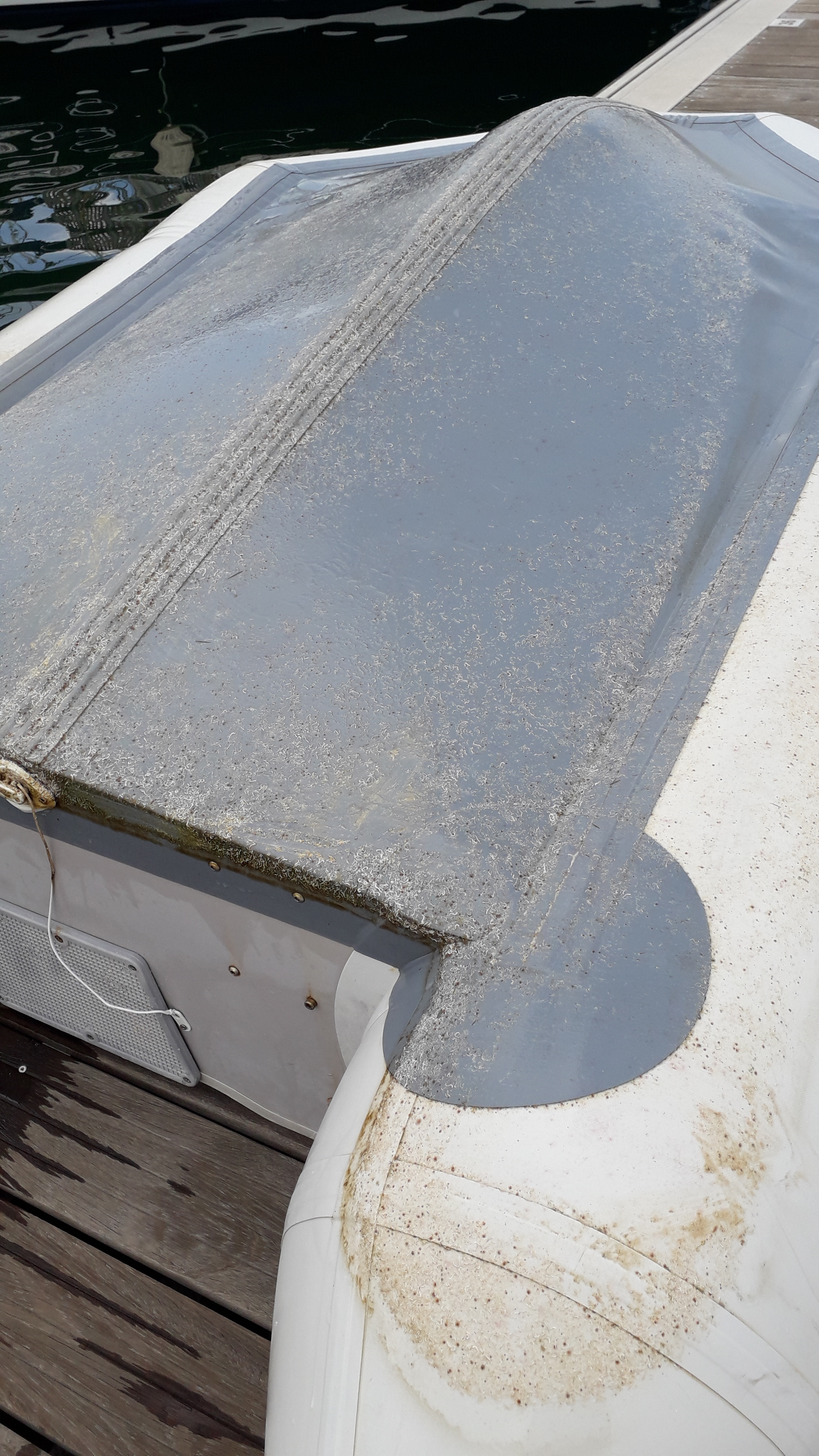 Quinze jours dans l’eau du port et elle était toute sale, grasse et pleine de petits coquillages ! Maintenant, elle est accrochée en l’air, au bout de la drisse de spi, ce sera bien mieux !