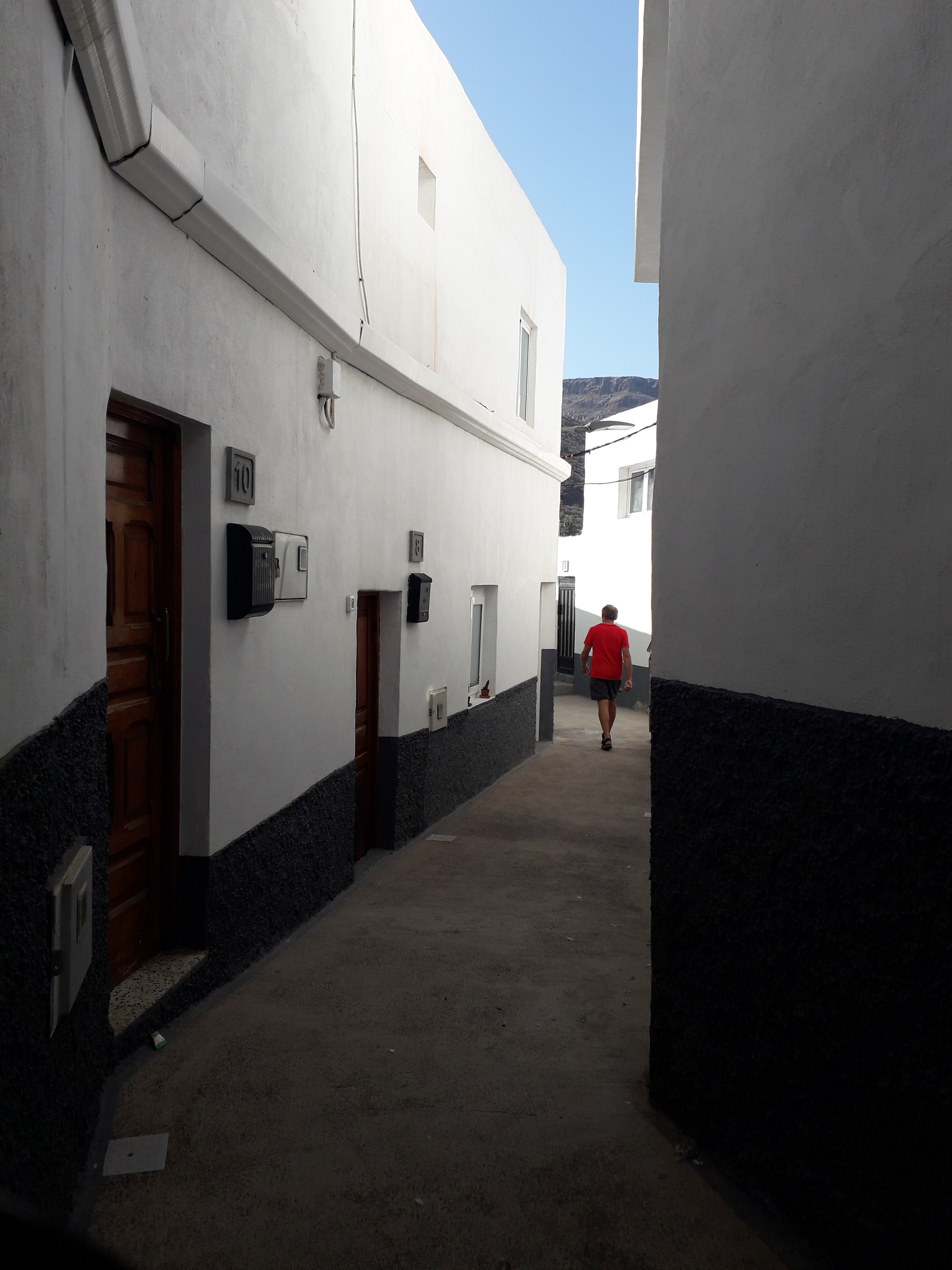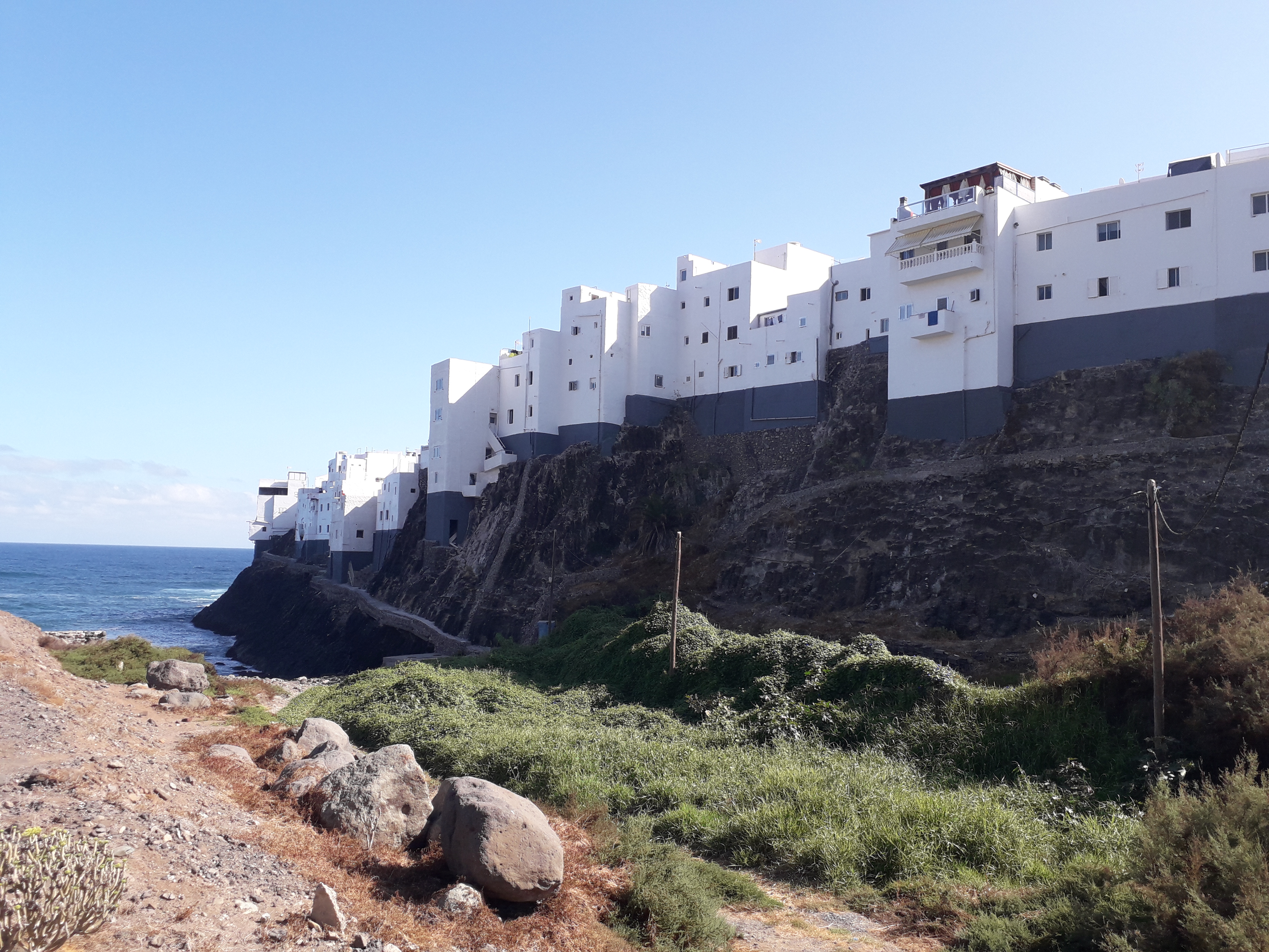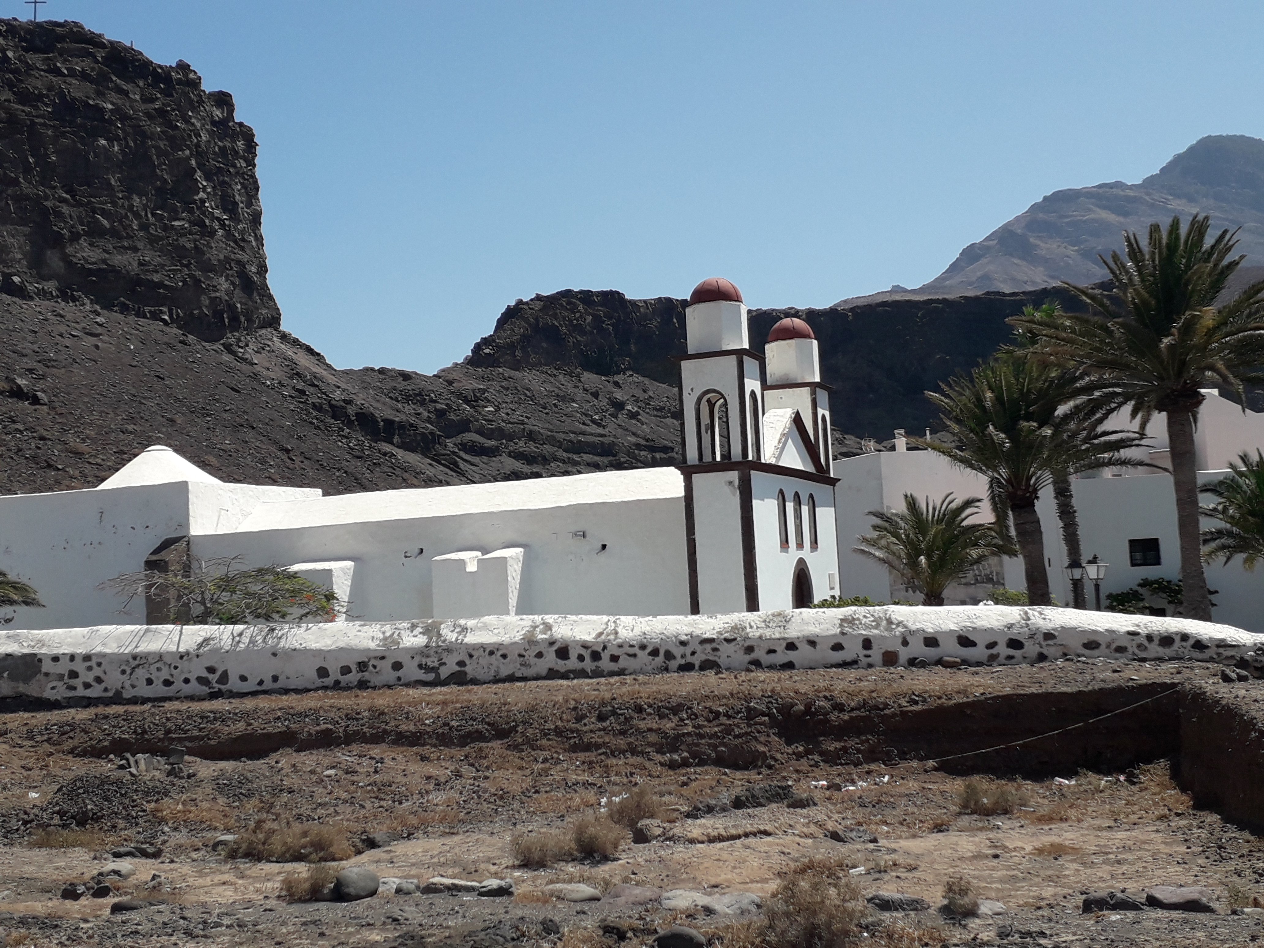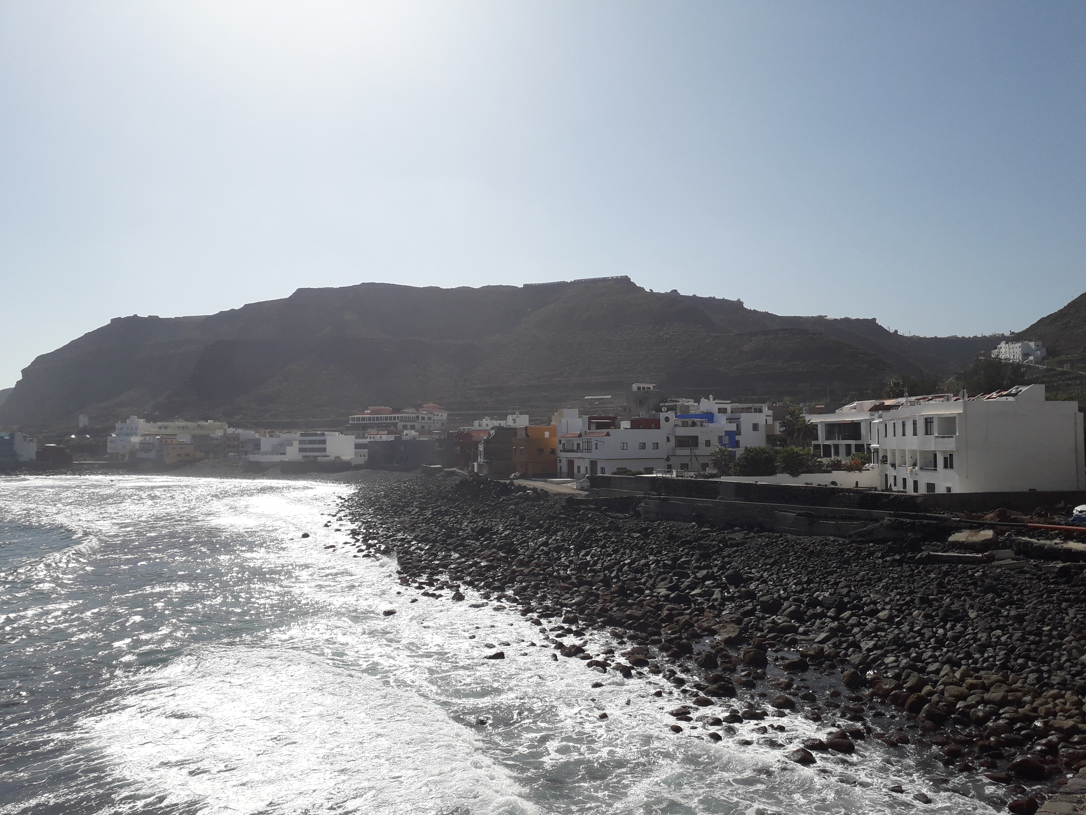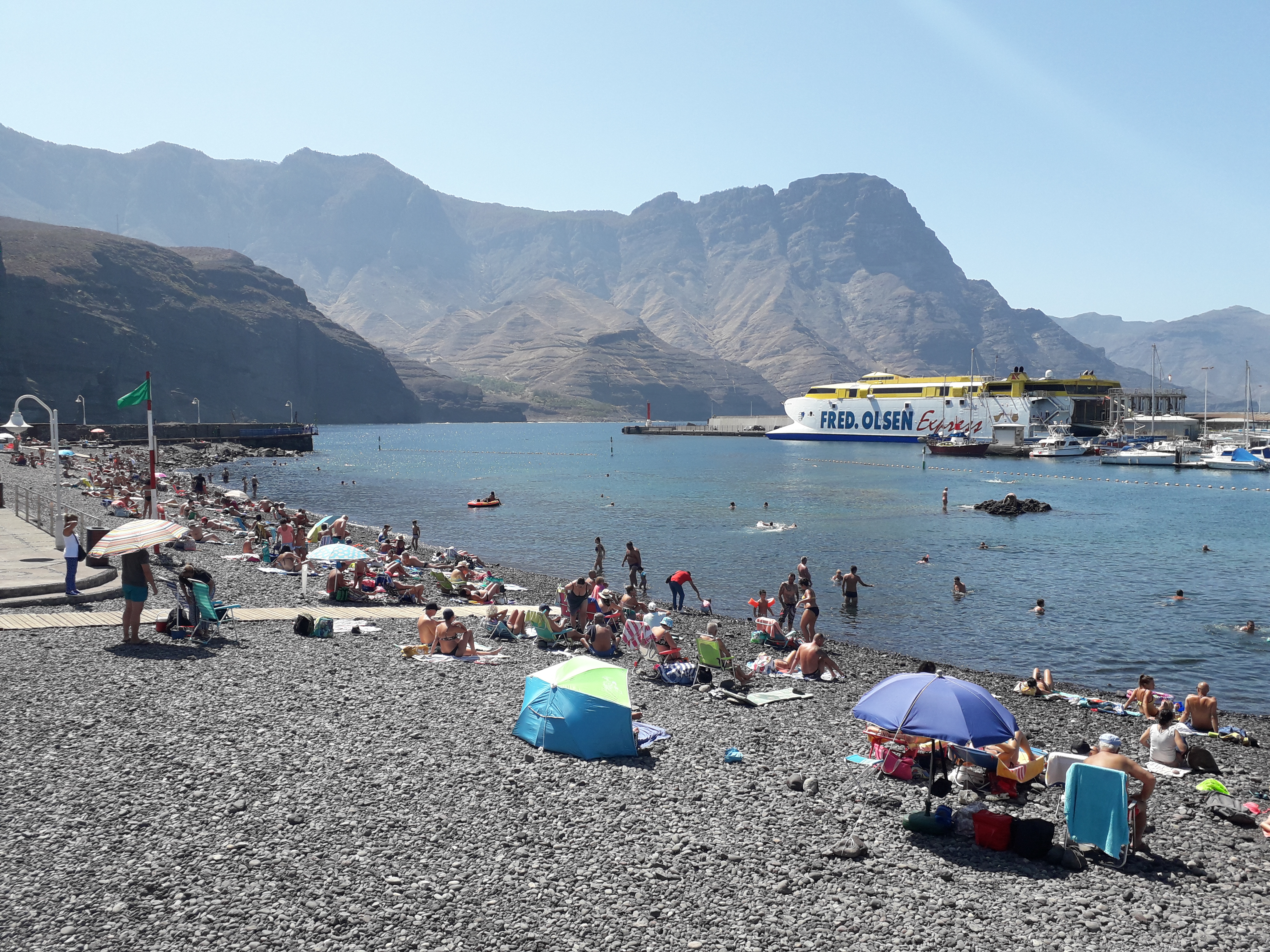 Une belle plage de galets noirs, une foule colorée de familles avec plein d’enfants, on voit que c’est dimanche. La plage, et juste en face, le quai pour le ferry qui relie à Las Palmas et aussi à Tenerife.