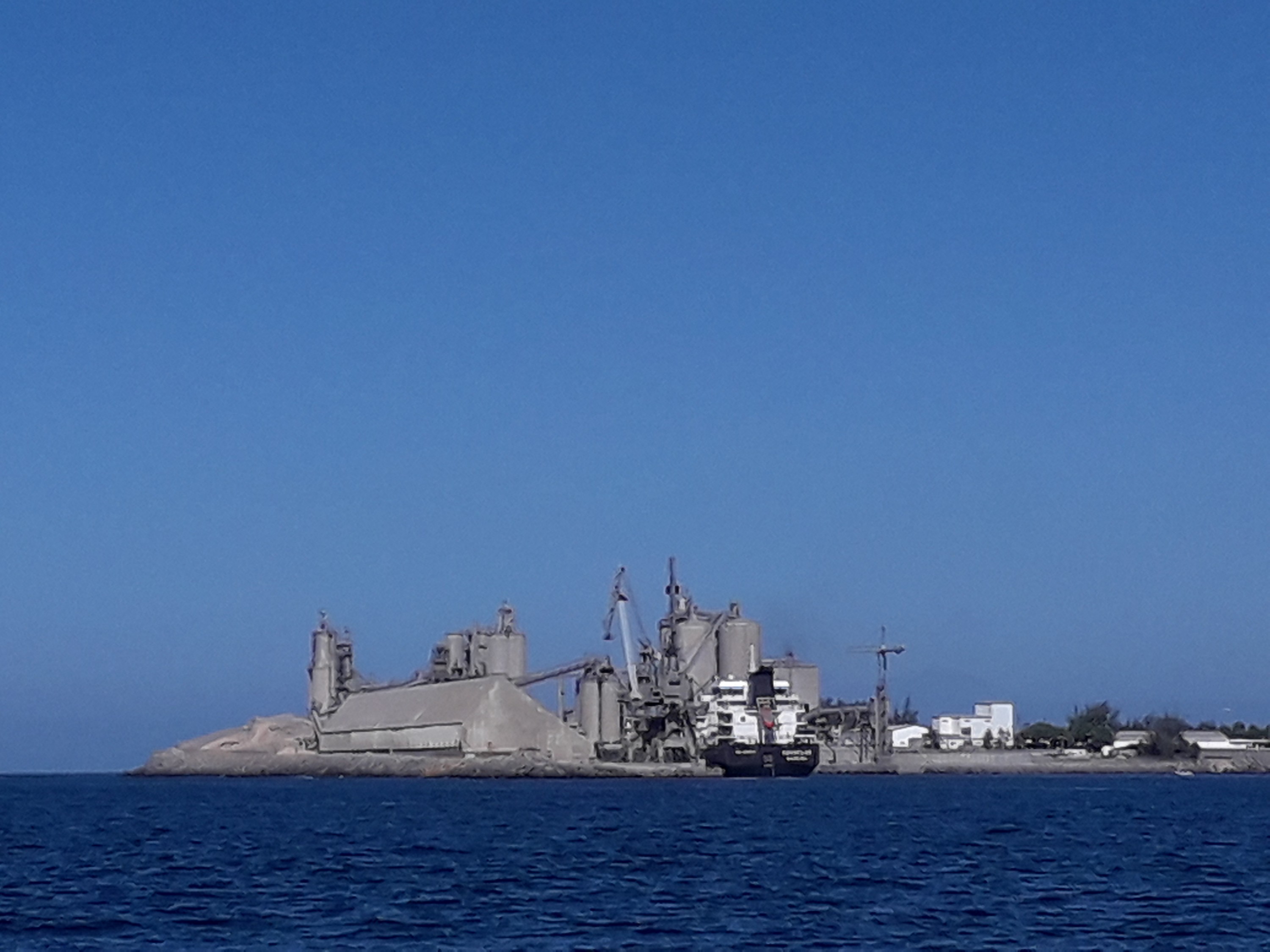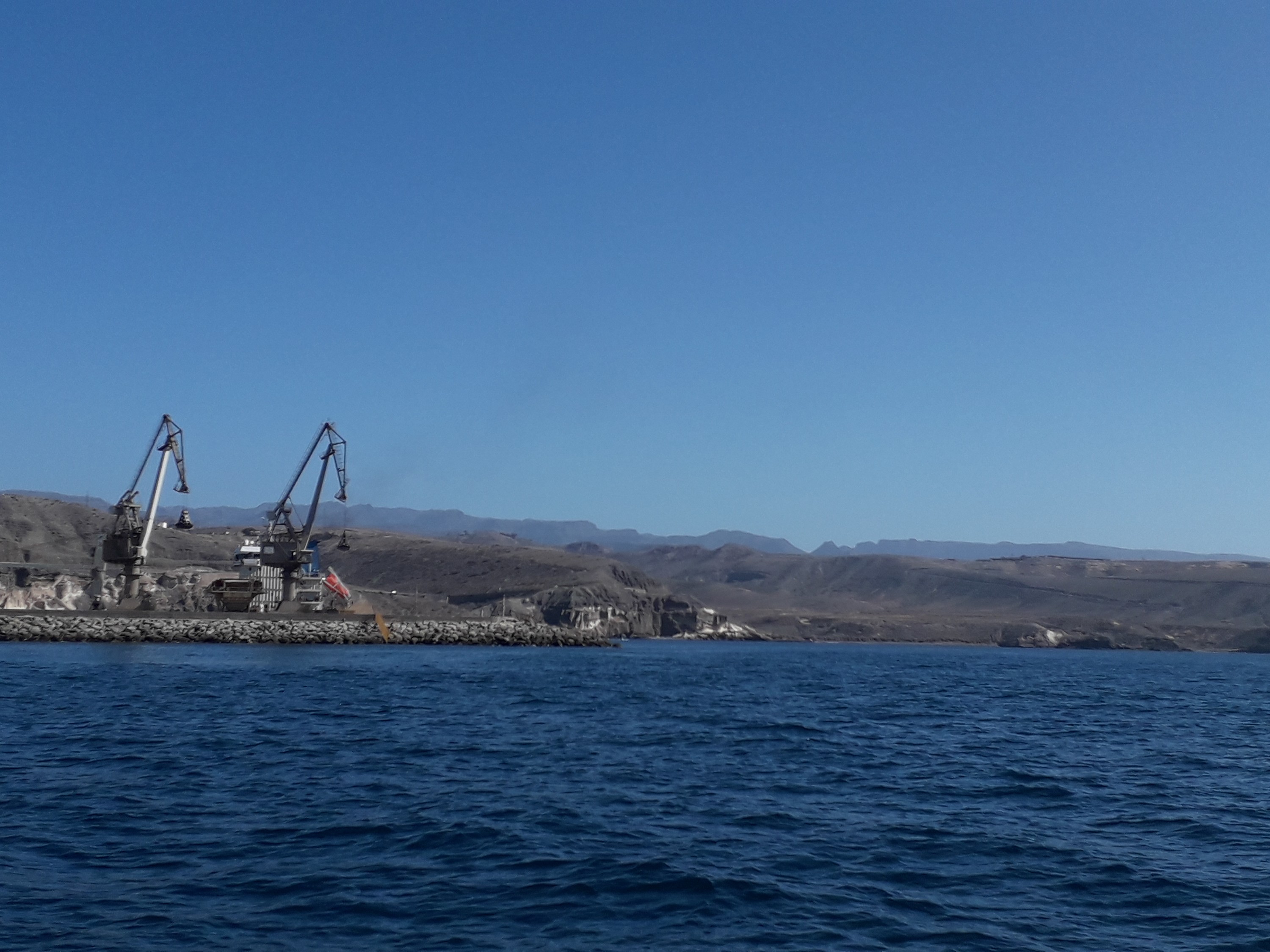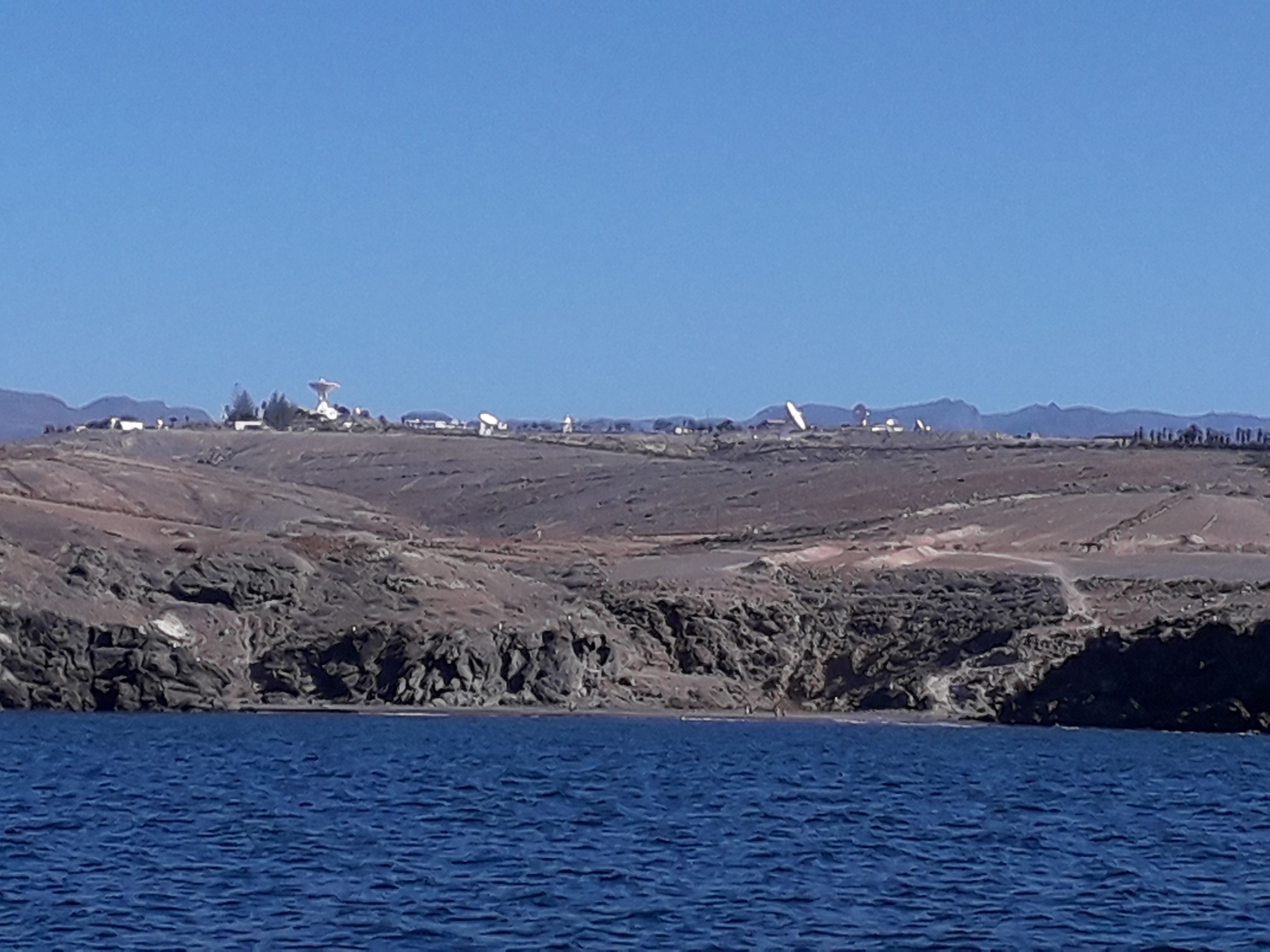 En chemin, des antennes aux grandes oreilles … la Nasa toujours ?Et puis, une belle cimenterie qui transforme de loin le paysage en vignettes de BD de Druillet. On a changé, en chemin, le pavillon de courtoisie. Celui qu’ on avait était tellement abîmé que c’était un affront pour le pays . Maintenant, on a le pavillon espagnol, sans la couronne, c’est un gouvernement socialiste que diable, et puis le pavillon blanc, bleu jaune des Canaries ! Et puis, notre mouillage, devant la plage et le petit port d’Arguineguin. Une grande petite ville d’un coup, après ces 3 jours au vert ! …Là, c’est bien, on voit le Teide au loin … on sait comme ça où on va aller après ! … C’est tranquille. Erick est parti avec l’annexe dans le port voir comment c’est pour débarquer. On va déjeuner … et après balade à terre , je vous raconterai ! Mina trouve que c’est plutôt pas mal !A suivre !