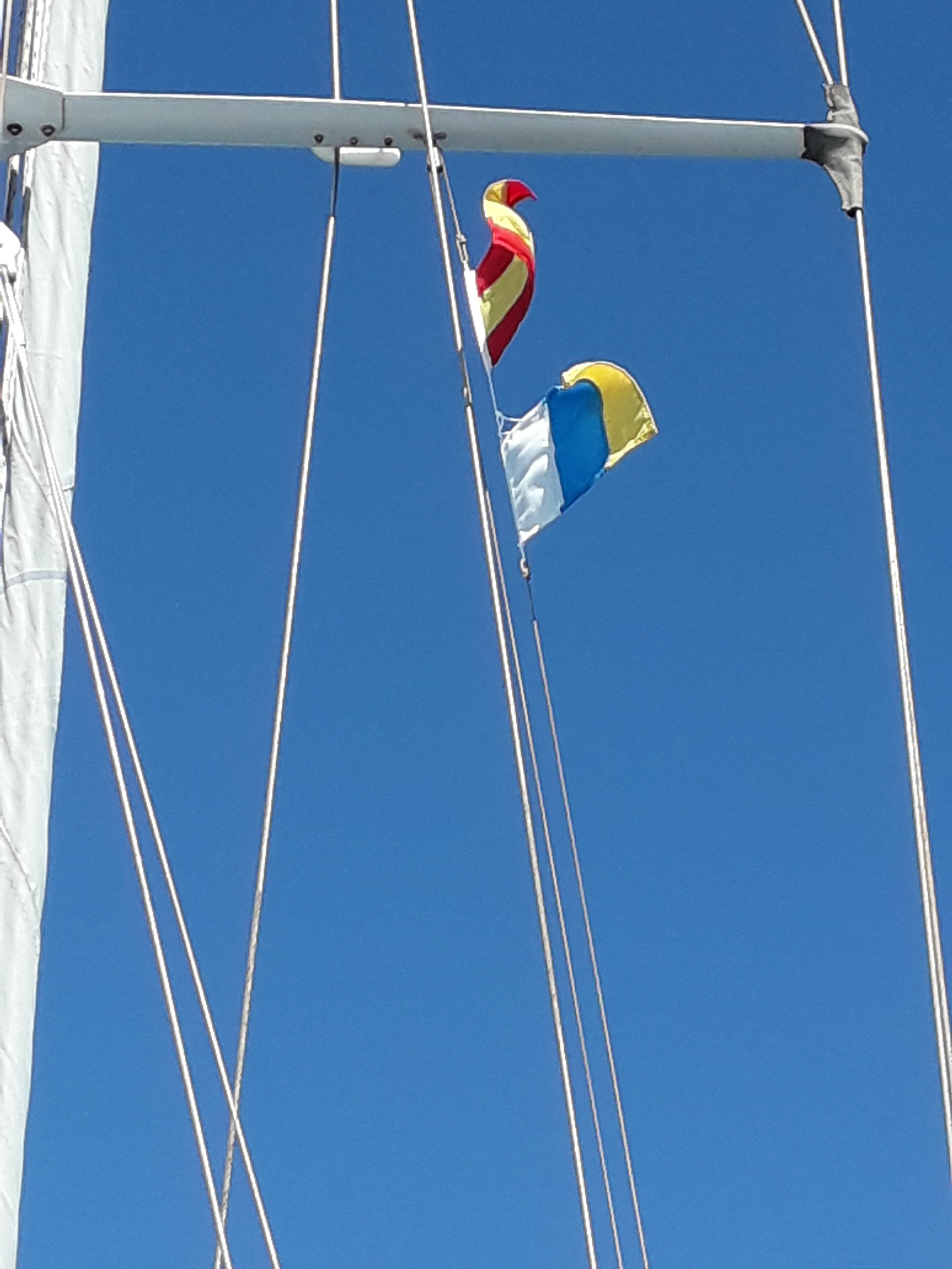 Aujourd’hui, lundi 16, il pleut ! … dès le matin, ciel gris, quelques gouttes, pas suffisantes pour enlever la poussière de sable qui colore en marron les drisses et les hauts du bateau. Depuis notre arrivée, on a réussi à nettoyer en partie le plus gros, Erick est même monté en tête de mât en début de semaine dernière avec un seau d’eau, des micro fibres, pour nettoyer le mât, les barres de flèches, le gréement, le radar, au fur et à mesure que je le descendais, mais ça restait un peu « marronnasse » !