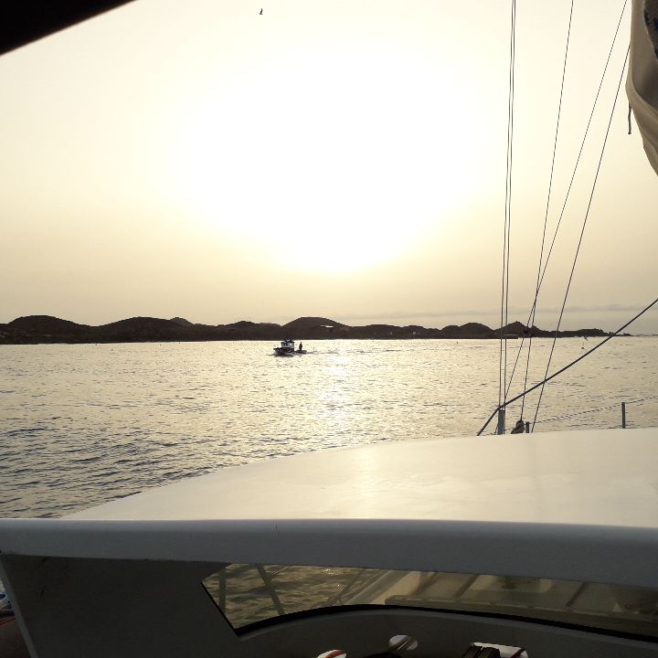 Voilà … rien de marquant ! La petite inquiétude peut être, de rentrer par une nuit très noire, en annexe, le soir de la fête de la musique, sans savoir où est réellement la pointe de roches basses qu’ il faut contourner pour entrer dans la baie. Aussi, les bains avec les bancs de poissons dans la baie à côté dans laquelle on n’a pas le droit de mouiller.